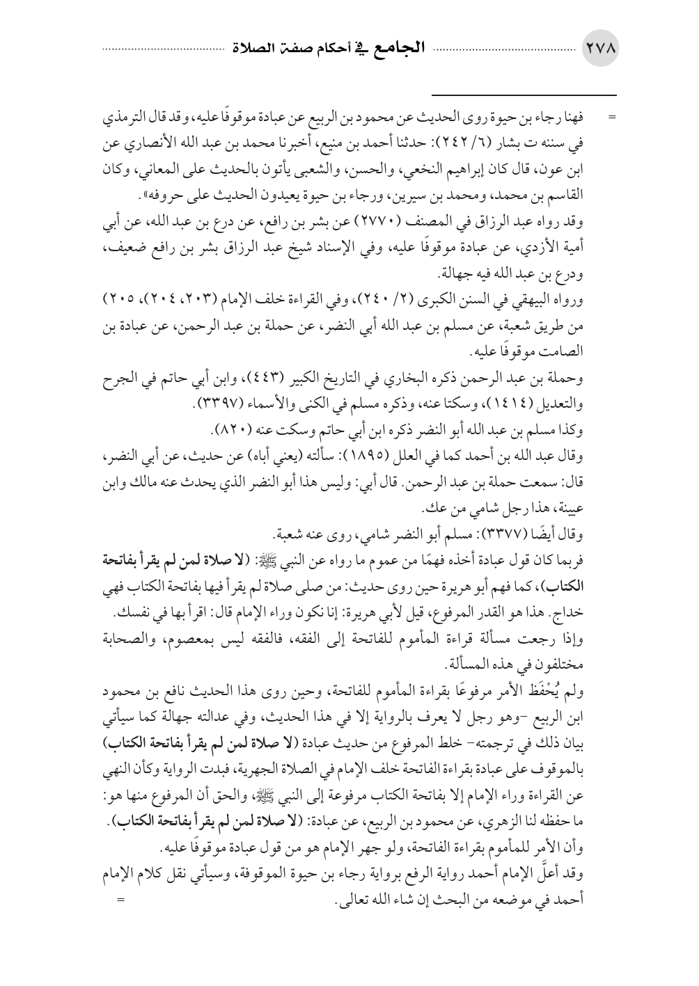 ورواه البيهقي في السنن الكبرى (٢/ ٢٤٠)، وفي القراءة خلف الإمام (٢٠٣، ٢٠٤)، ٢٠٥) من طريق شعبة، عن مسلم بن عبد الله أبي النضر، عن حملة بن عبد الرحمن، عن عبادة بن الصامت موقوفًا عليه.