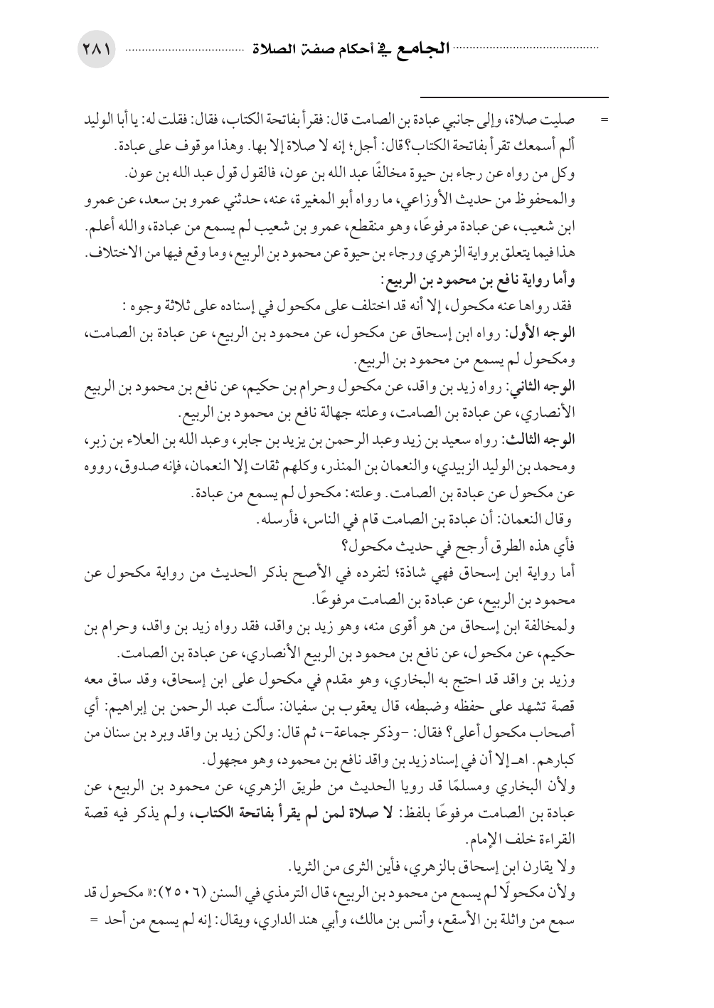 = صليت صلاة، وإلى جانبي عبادة بن الصامت قال: فقرأ بفاتحة الكتاب، فقال: فقلت له: يا أبا الوليد ألم أسمعك تقرأ بفاتحة الكتاب؟ قال: أجل؛ إنه لا صلاة إلا بها. وهذا موقوف على عبادة. ... وكل من رواه عن رجاء بن حيوة مخالفًا عبد الله بن عون، فالقول قول عبد الله بن عون.