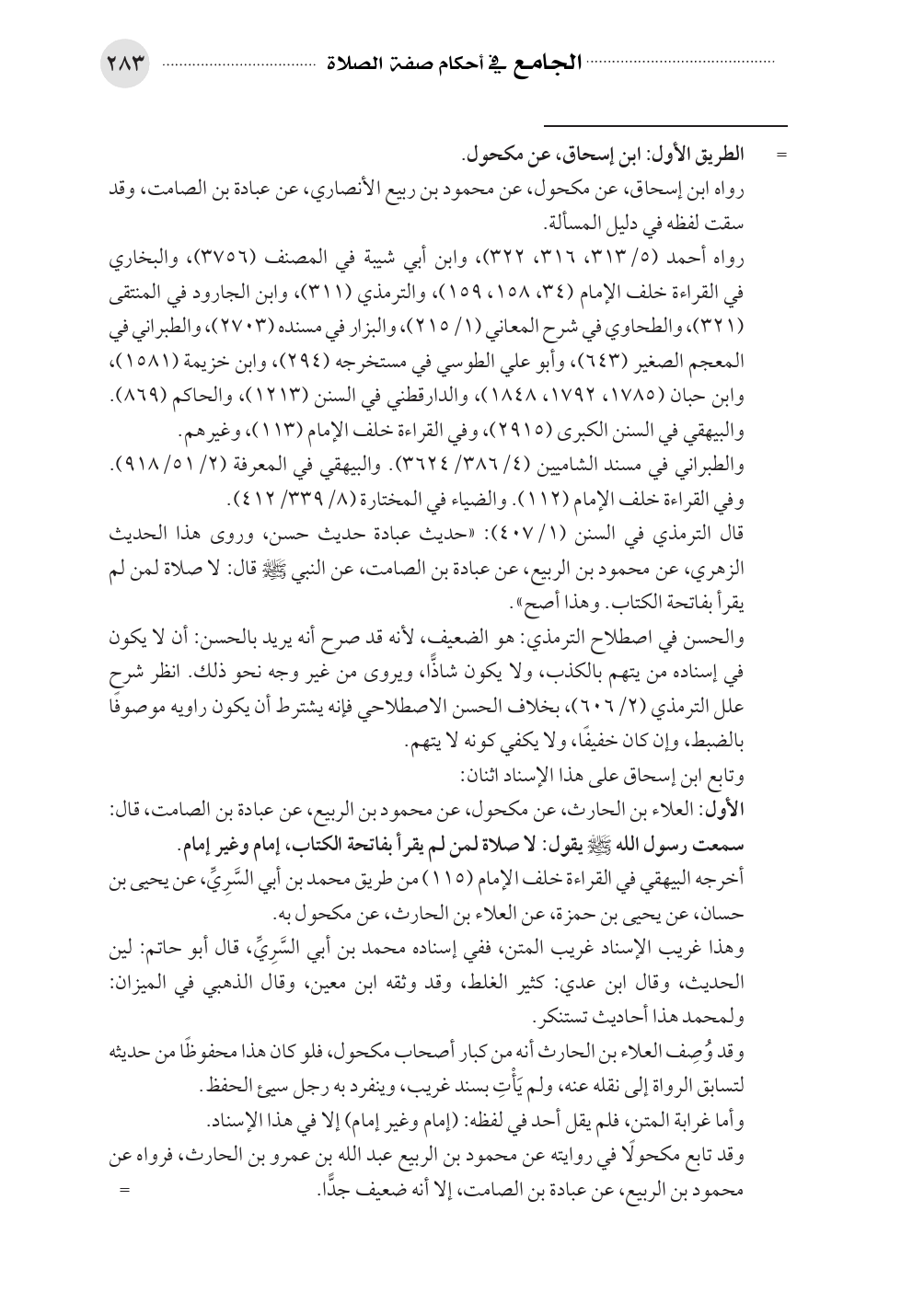 قال الترمذي في السنن (١/ ٤٠٧): «حديث عبادة حديث حسن، وروى هذا الحديث الزهري، عن محمود بن الربيع، عن عبادة بن الصامت، عن النبي صلى الله عليه وسلم قال: لا صلاة لمن لم يقرأ بفاتحة الكتاب. وهذا أصح».