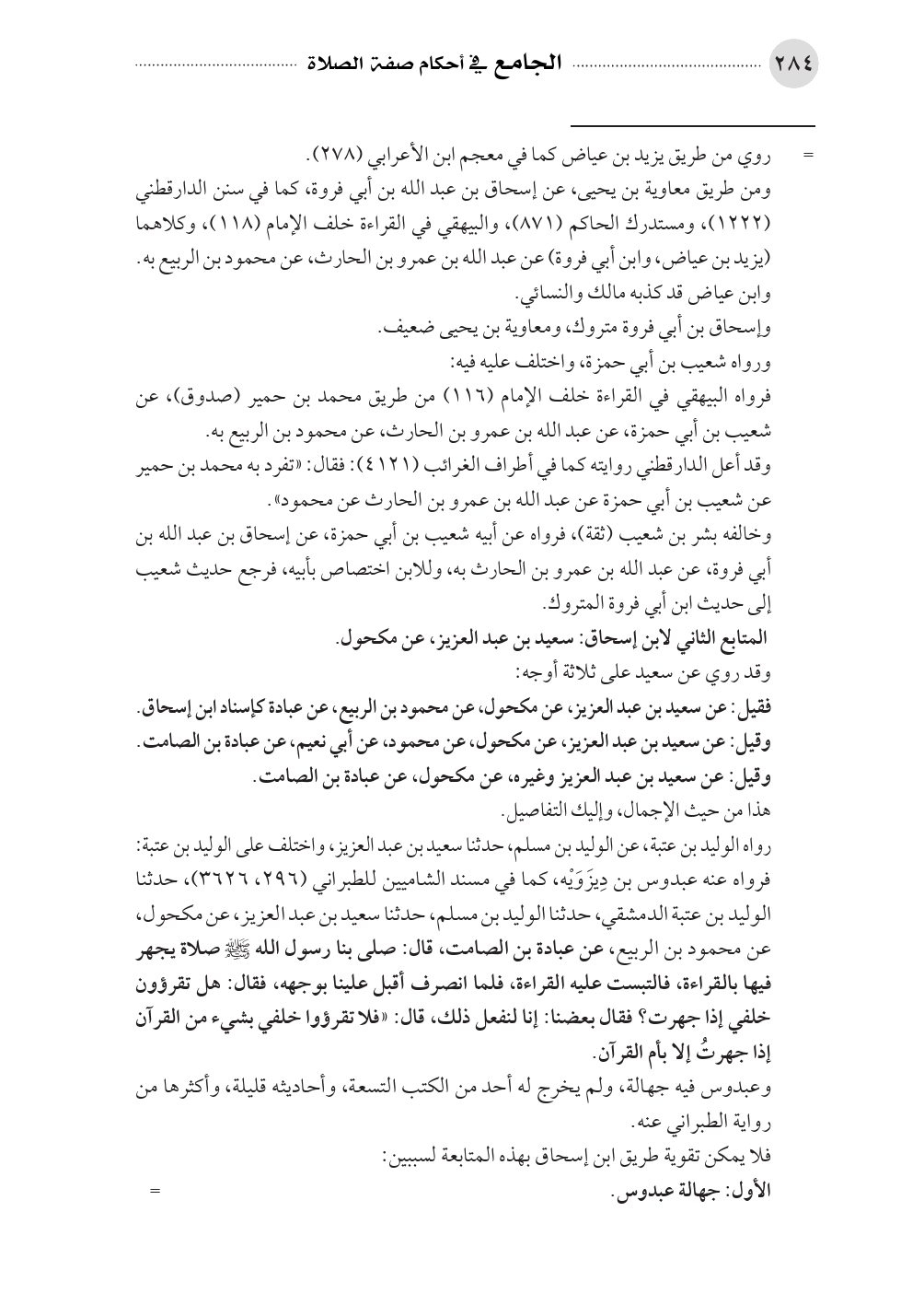 ومن طريق معاوية بن يحيى، عن إسحاق بن عبد الله بن أبي فروة، كما في سنن الدارقطني (١٢٢٢)، ومستدرك الحاكم (٨٧١)، والبيهقي في القراءة خلف الإمام (١١٨)، وكلاهما (يزيد بن عياض، وابن أبي فروة) عن عبد الله بن عمرو بن الحارث، عن محمود بن الربيع به.