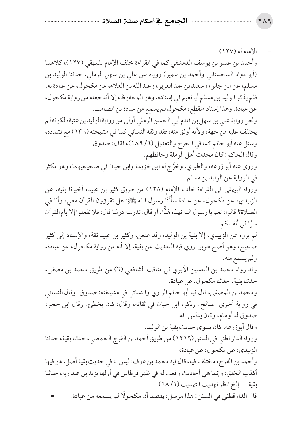 وأحمد بن عمير بن يوسف الدمشقي كما في القراءة خلف الإمام للبيهقي (١٢٧)، كلاهما (أبو دواد السجستاني وأحمد بن عمير) روياه عن علي بن سهل الرملي، حدثنا الوليد بن مسلم، عن ابن جابر، وسعيد بن عبد العزيز، وعبد الله بن العلاء، عن مكحول، عن عبادة به.