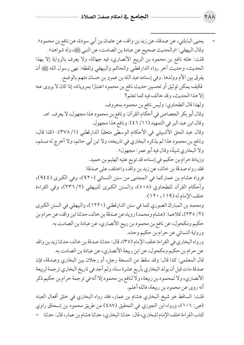 قال المعلمي: كذا قال: وقد سقط من النسخة رجل، أو رجلان بين البخاري وصدقة، فإن صدقة مات قبل أن يولد البخاري بأربع عشرة سنة، ولم أجد في تاريخ البخاري ترجمة لربيعة الأنصاري، ولا لمحمود بن ربيعة، ولا لنافع بن محمود إلا أنه في ترجمة حرام بن حكيم ذكر أنه روى عن محمود بن ربيعة، فالله أعلم.