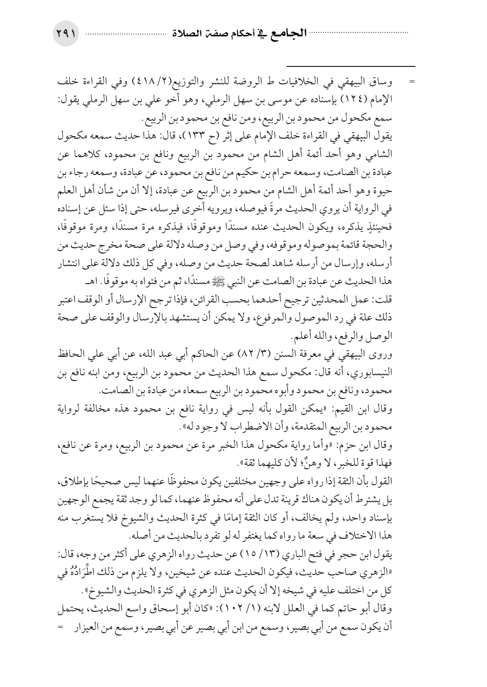 يقول البيهقي في القراءة خلف الإمام على إثر (ح ١٣٣)، قال: هذا حديث سمعه مكحول الشامي وهو أحد أئمة أهل الشام من محمود بن الربيع ونافع بن محمود، كلاهما عن عبادة بن الصامت، وسمعه حرام بن حكيم من نافع بن محمود، عن عبادة، وسمعه رجاء بن حيوة وهو أحد أئمة أهل الشام من محمود بن الربيع عن عبادة، إلا أن من شأن أهل العلم في الرواية أن يروي الحديث مرةً فيوصله، ويرويه أخرى فيرسله، حتى إذا سئل عن إسناده فحينئذٍ يذكره، ويكون الحديث عنده مسندًا وموقوفًا، فيذكره مرة مسندًا، ومرة موقوفًا، والحجة قائمة بموصوله وموقوفه، وفي وصل من وصله دلالة على صحة مخرج حديث من أرسله، وإرسال من أرسله شاهد لصحة حديث من وصله، وفي كل ذلك دلالة على انتشار هذا الحديث عن عبادة بن الصامت عن النبي صلى الله عليه وسلم مسندًا، ثم من فتواه به موقوفًا. اهـ