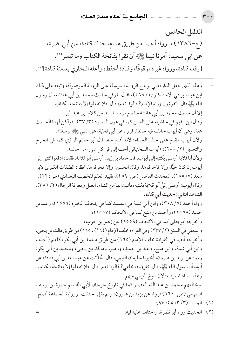 وهذا الذي جعل الدارقطني يرجح الرواية المرسلة على الرواية الموصولة، وتبعه على ذلك ابن عبد البر في الاستذكار (١/ ٤٦٨)، فقال: «وفي حديث محمد بن أبي عائشة، أن رسول الله صلى الله عليه وسلم قال: أتقرؤون وراء الإمام؟ قالوا: نعم، قال: فلا تفعلوا إلا بفاتحة الكتاب.