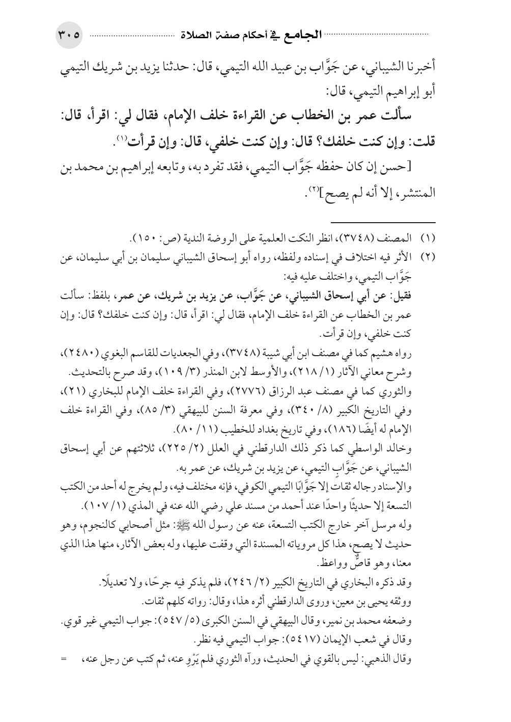 فقيل: عن أبي إسحاق الشيباني، عن جَوَّاب، عن يزيد بن شريك، عن عمر، بلفظ: سألت عمر بن الخطاب عن القراءة خلف الإمام، فقال لي: اقرأ، قال: وإن كنت خلفك؟ قال: وإن كنت خلفي، وإن قرأت.