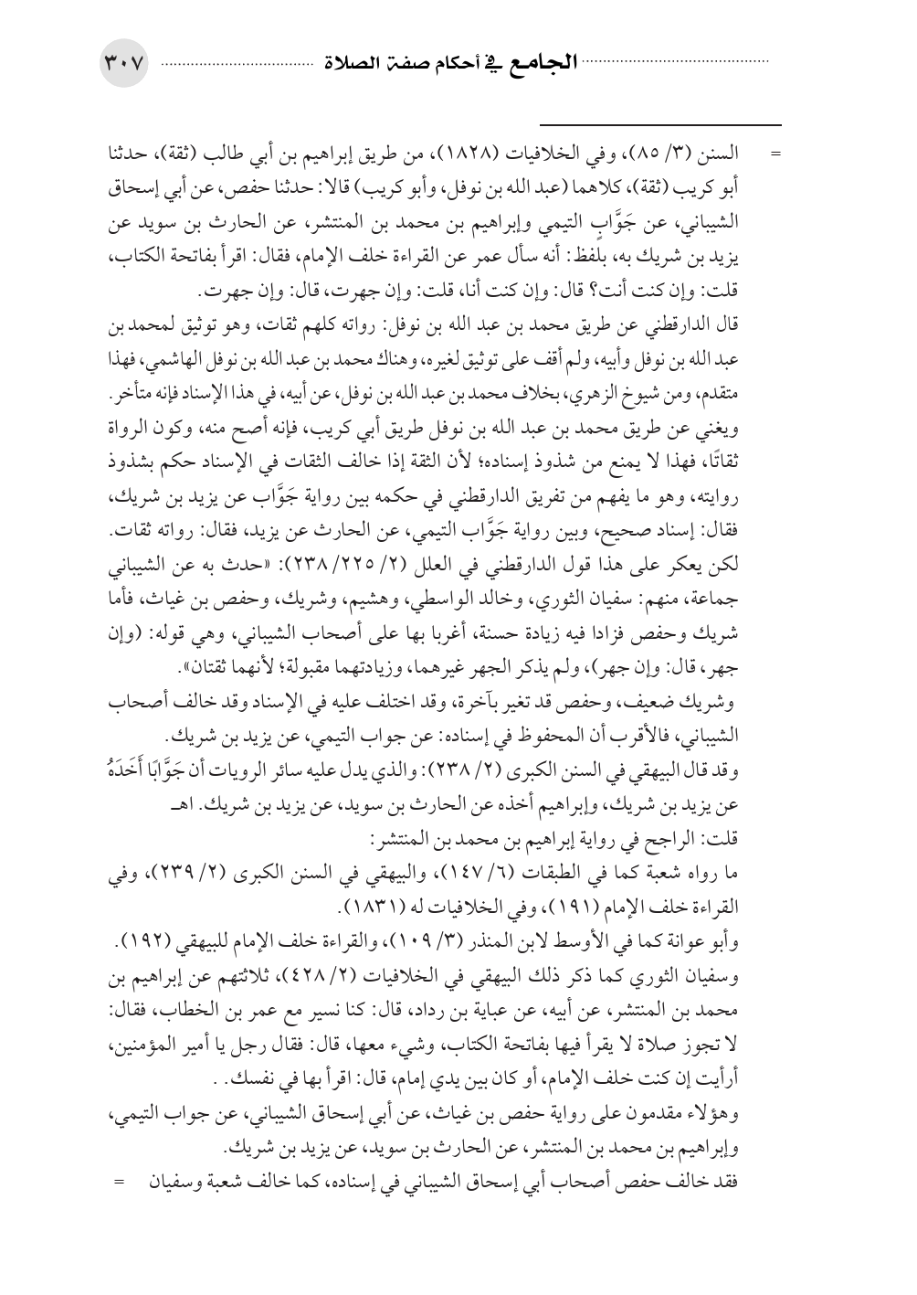 ويغني عن طريق محمد بن عبد الله بن نوفل طريق أبي كريب، فإنه أصح منه، وكون الرواة ثقاتًا، فهذا لا يمنع من شذوذ إسناده؛ لأن الثقة إذا خالف الثقات في الإسناد حكم بشذوذ روايته، وهو ما يفهم من تفريق الدارقطني في حكمه بين رواية جَوَّاب عن يزيد بن شريك، فقال: إسناد صحيح، وبين رواية جَوَّاب التيمي، عن الحارث عن يزيد، فقال: رواته ثقات. لكن يعكر على هذا قول الدارقطني في العلل (٢/ ٢٢٥/٢٣٨): «حدث به عن الشيباني جماعة، منهم: سفيان الثوري، وخالد الواسطي، وهشيم، وشريك، وحفص بن غياث، فأما شريك وحفص فزادا فيه زيادة حسنة، أغربا بها على أصحاب الشيباني، وهي قوله: (وإن جهر، قال: وإن جهر)، ولم يذكر الجهر غيرهما، وزيادتهما مقبولة؛ لأنهما ثقتان».