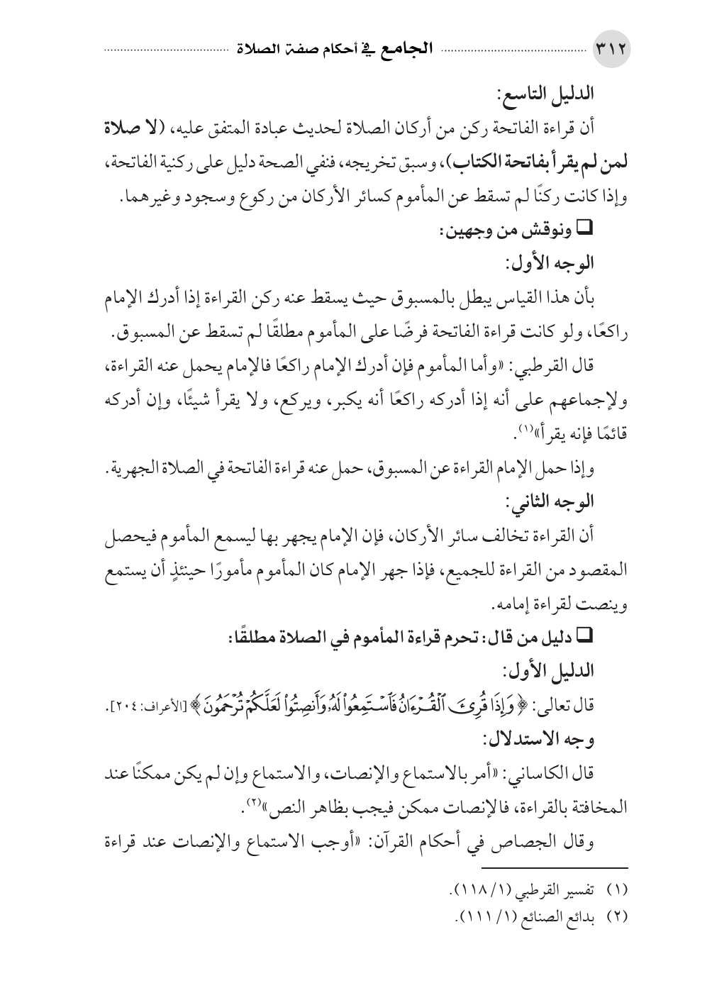 قال الكاساني: «أمر بالاستماع والإنصات، والاستماع وإن لم يكن ممكنًا عند المخافتة بالقراءة، فالإنصات ممكن فيجب بظاهر النص» (¬٢).