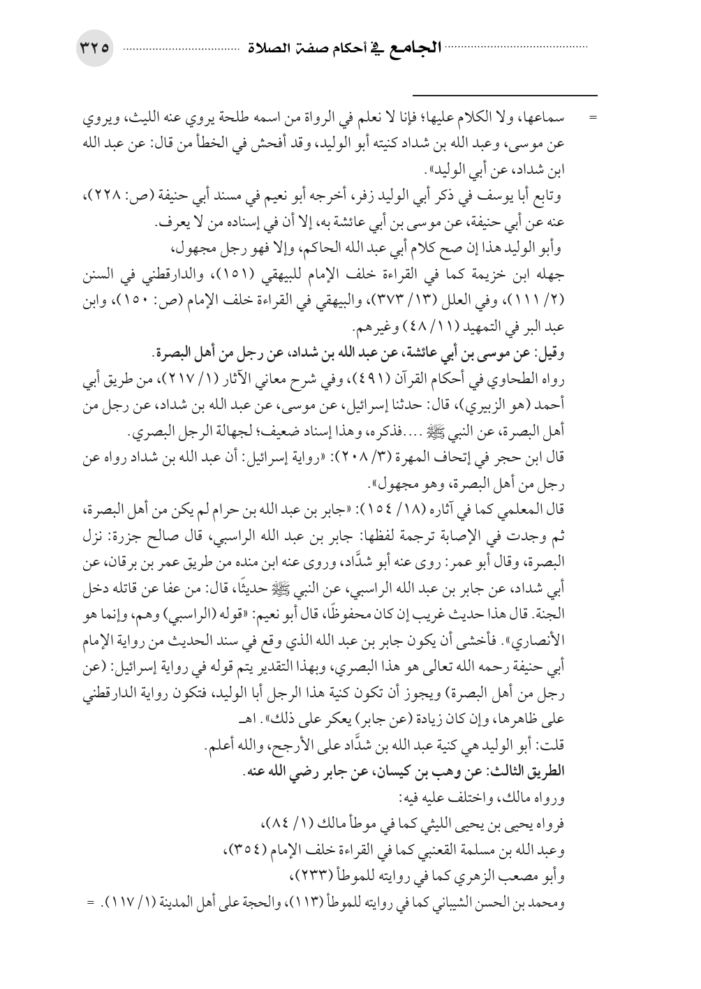 قال المعلمي كما في آثاره (١٨/ ١٥٤): «جابر بن عبد الله بن حرام لم يكن من أهل البصرة، ثم وجدت في الإصابة ترجمة لفظها: جابر بن عبد الله الراسبي، قال صالح جزرة: نزل البصرة، وقال أبو عمر: روى عنه أبو شدَّاد، وروى عنه ابن منده من طريق عمر بن برقان، عن أبي شداد، عن جابر بن عبد الله الراسبي، عن النبي صلى الله عليه وسلم حديثًا، قال: من عفا عن قاتله دخل الجنة. قال هذا حديث غريب إن كان محفوظًا، قال أبو نعيم: «قوله (الراسبي) وهم، وإنما هو الأنصاري». فأخشى أن يكون جابر بن عبد الله الذي وقع في سند الحديث من رواية الإمام أبي حنيفة رحمه الله تعالى هو هذا البصري، وبهذا التقدير يتم قوله في رواية إسرائيل: (عن رجل من أهل البصرة) ويجوز أن تكون كنية هذا الرجل أبا الوليد، فتكون رواية الدارقطني على ظاهرها، وإن كان زيادة (عن جابر) يعكر على ذلك». اهـ