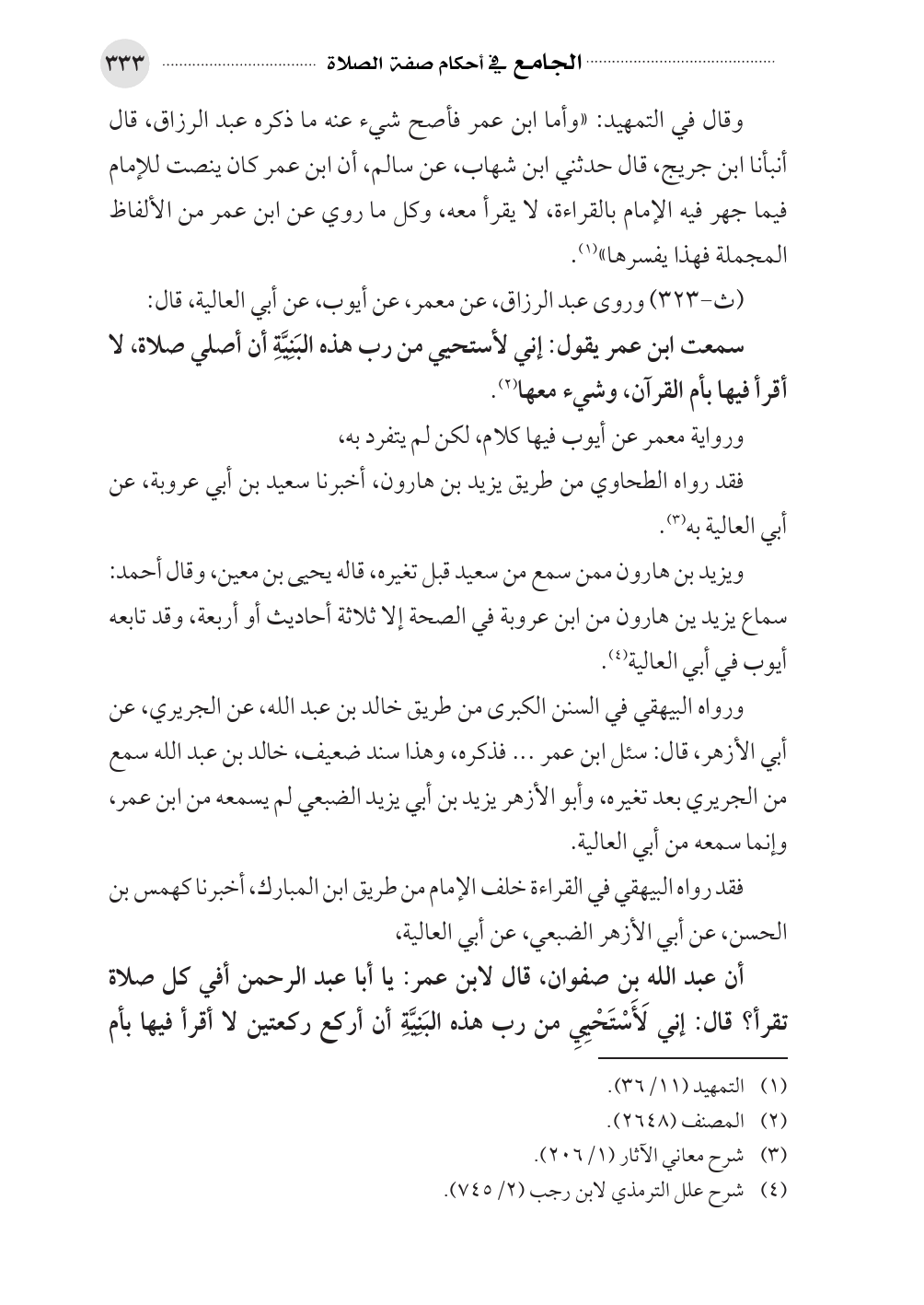 أن عبد الله بن صفوان، قال لابن عمر: يا أبا عبد الرحمن أفي كل صلاة تقرأ؟ قال: إني لَأَسْتَحْيِيِ من رب هذه البَنِيَّةِ أن أركع ركعتين لا أقرأ فيها بأم