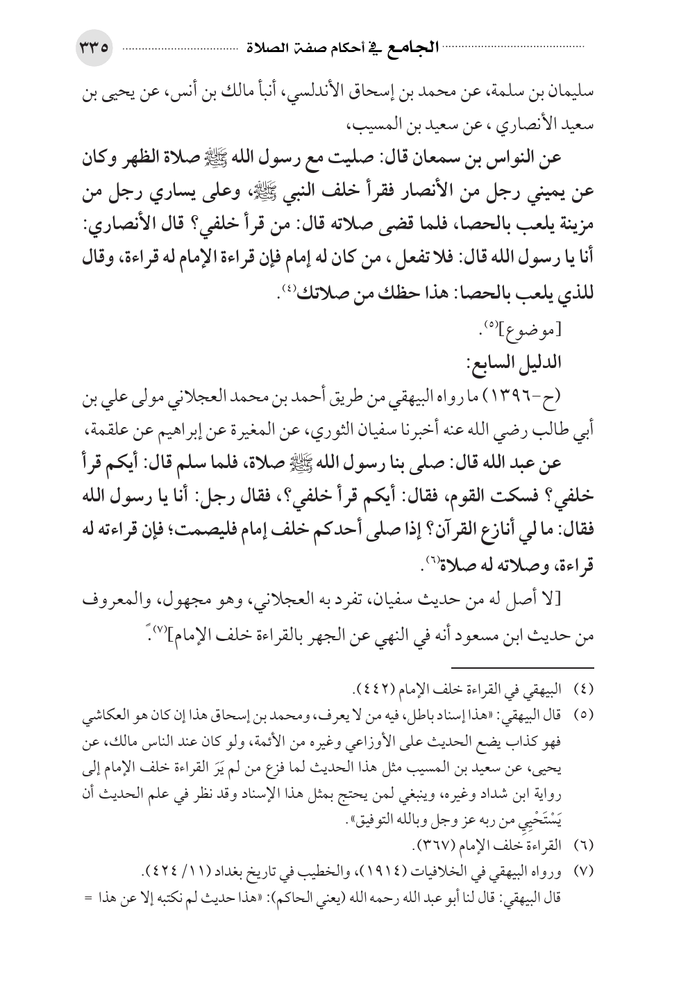(¬٢). قال البيهقي: «هذا إسناد باطل، فيه من لا يعرف، ومحمد بن إسحاق هذا إن كان هو العكاشي فهو كذاب يضع الحديث على الأوزاعي وغيره من الأئمة، ولو كان عند الناس مالك، عن يحيى، عن سعيد بن المسيب مثل هذا الحديث لما فزع من لم يَرَ القراءة خلف الإمام إلى رواية ابن شداد وغيره، وينبغي لمن يحتج بمثل هذا الإسناد وقد نظر في علم الحديث أن يَسْتَحْيِيِ من ربه عز وجل وبالله التوفيق».
