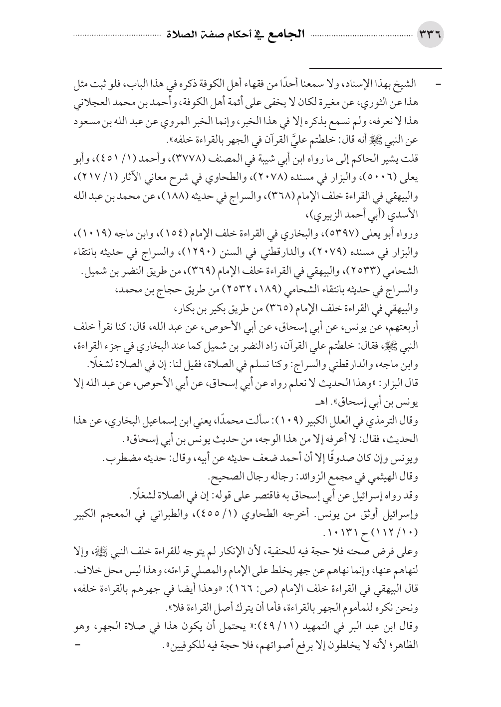 قال البيهقي في القراءة خلف الإمام (ص: ١٦٦): «وهذا أيضا في جهرهم بالقراءة خلفه، ونحن نكره للمأموم الجهر بالقراءة، فأما أن يترك أصل القراءة فلا».