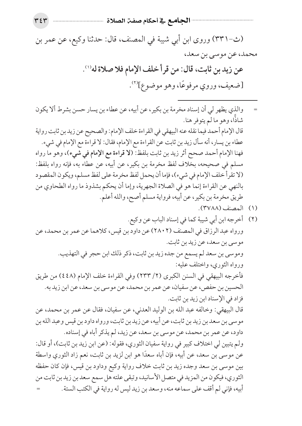 قال البيهقي: وخالفه عبد الله بن الوليد العدني، عن سفيان، فقال عن عمر بن محمد، عن موسى بن سعد بن زيد بن ثابت، عن أبيه، عن زيد بن ثابت، ورواه داود بن قيس وعبد الله بن داود، عن عمر بن محمد، عن موسى بن سعد، عن زيد، لم يذكر أباه في إسناده.