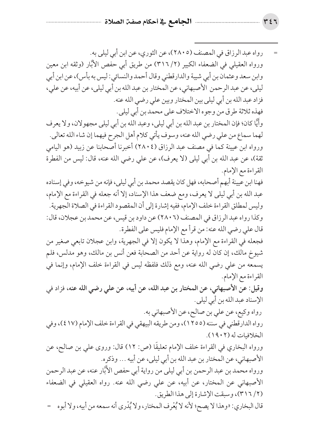 ورواه البخاري في القراءة خلف الإمام تعليقًا (ص: ١٢) قال: وروى علي بن صالح، عن الأصبهاني، عن المختار بن عبد الله بن أبي ليلى، عن أبيه ... وذكره.