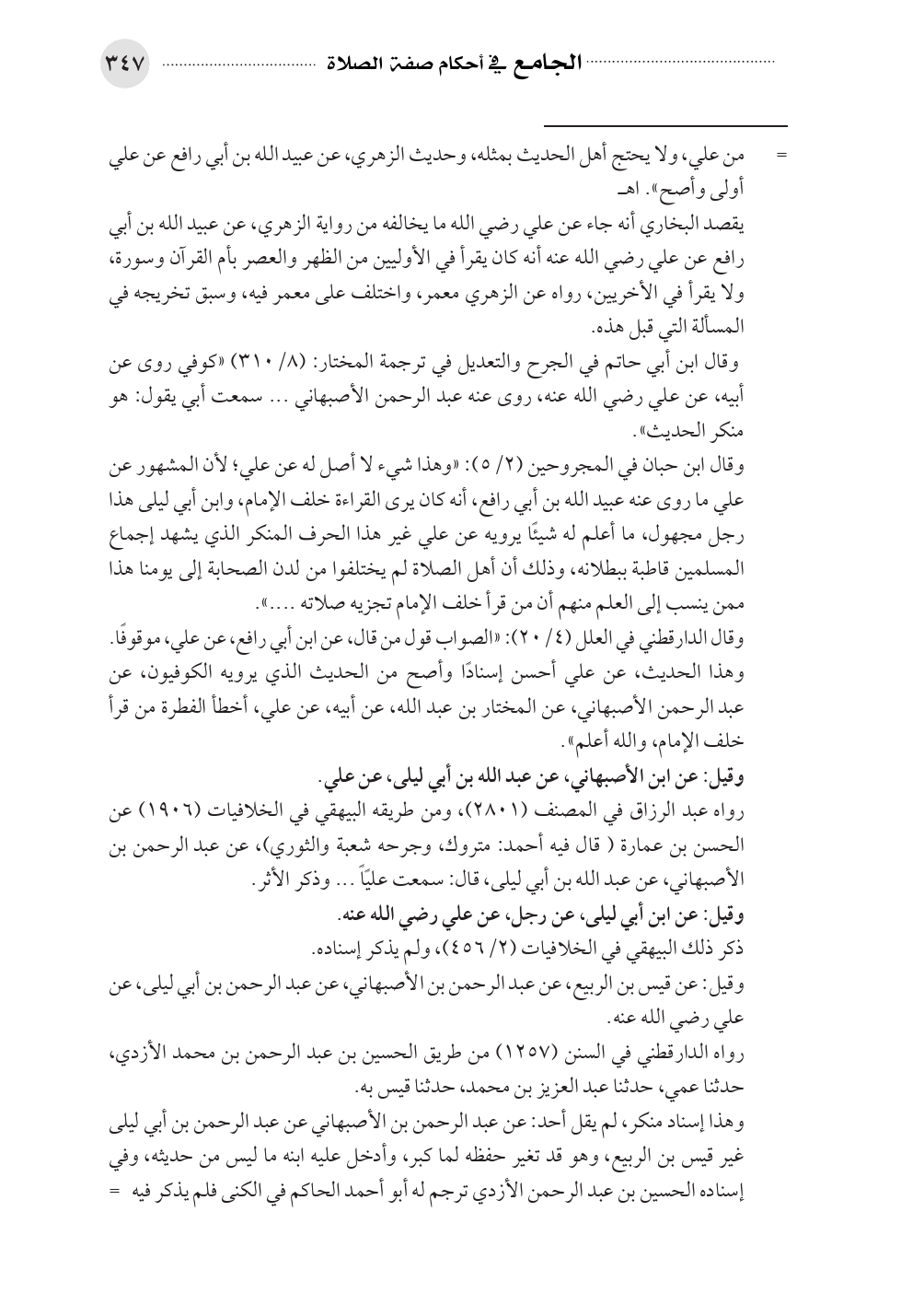 وهذا الحديث، عن علي أحسن إسنادًا وأصح من الحديث الذي يرويه الكوفيون، عن عبد الرحمن الأصبهاني، عن المختار بن عبد الله، عن أبيه، عن علي، أخطأ الفطرة من قرأ خلف الإمام، والله أعلم».