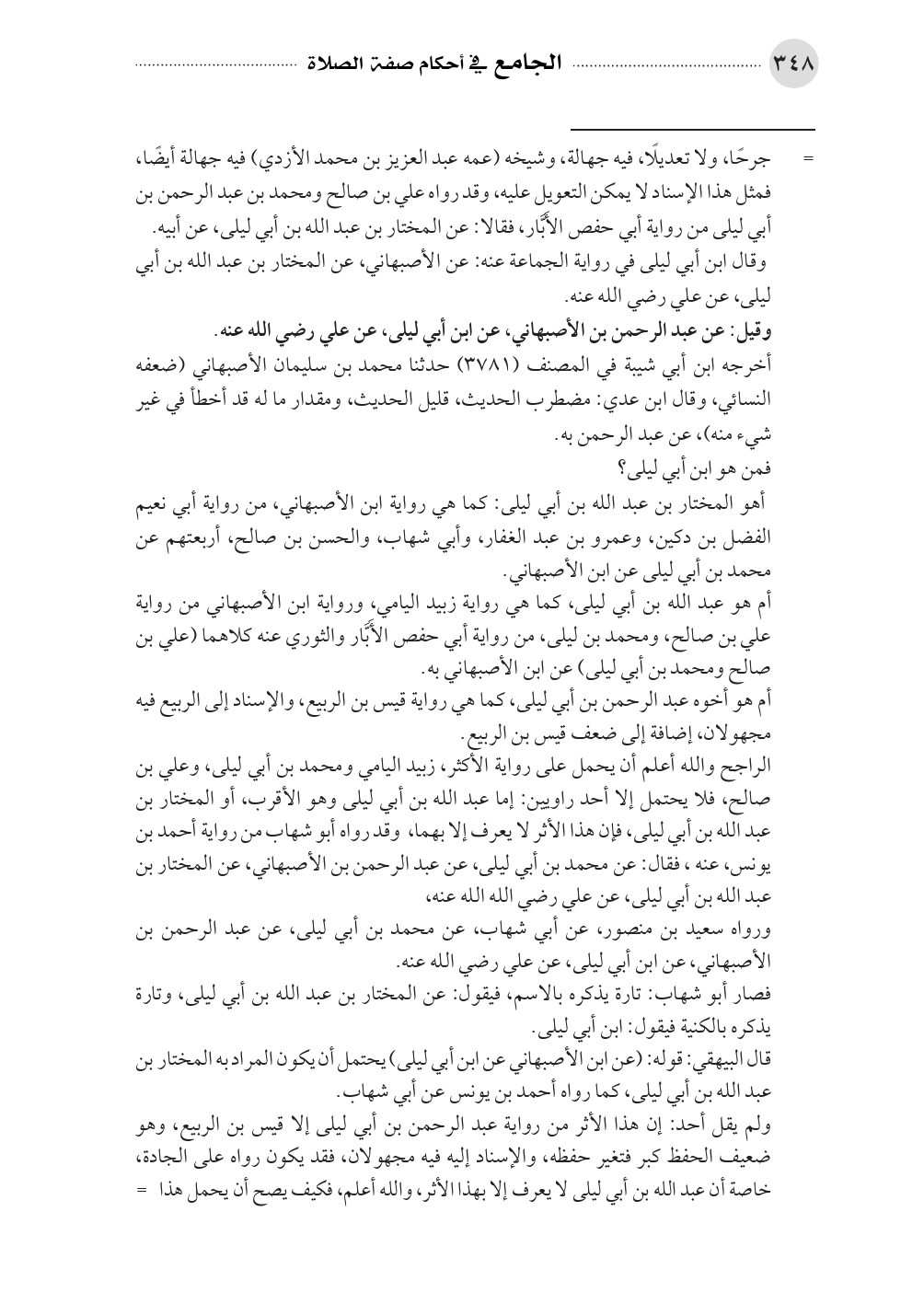 الراجح والله أعلم أن يحمل على رواية الأكثر، زبيد اليامي ومحمد بن أبي ليلى، وعلي بن صالح، فلا يحتمل إلا أحد راويين: إما عبد الله بن أبي ليلى وهو الأقرب، أو المختار بن عبد الله بن أبي ليلى، فإن هذا الأثر لا يعرف إلا بهما، وقد رواه أبو شهاب من رواية أحمد بن يونس، عنه، فقال: عن محمد بن أبي ليلى، عن عبد الرحمن بن الأصبهاني، عن المختار بن عبد الله بن أبي ليلى، عن علي رضي الله الله عنه،
