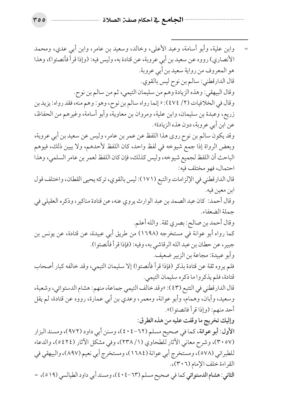قال الدارقطني في التتبع (٤٣): «وقد خالف التيمي جماعة، منهم: هشام الدستوائي، وشعبة، وسعيد، وأبان، وهمام، وأبو عوانة، ومعمر، وعدي بن أبي عمارة، رووه عن قتادة، لم يقل أحد منهم: (وإذا قرأ فانصتوا)».