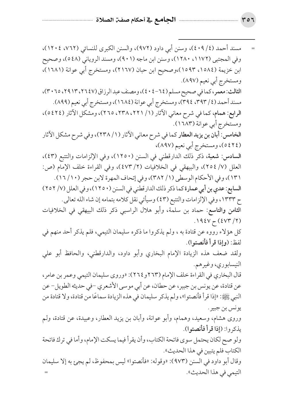 وقال أبو داود في السنن (٩٧٣): «وقوله: «فأنصتوا» ليس بمحفوظ، لم يجئ به إلا سليمان التيمي في هذا الحديث». =