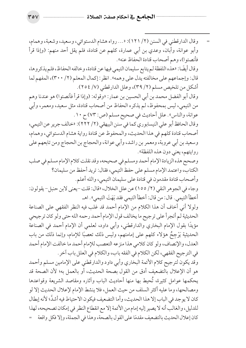 وقال أبو الفضل محمد بن أبي الحسين بن عمار: «وقوله: (وإذا قرأ فأنصتوا) هو عندنا وهم من التيمي، ليس بمحفوظ، لم يذكره الحفاظ من أصحاب قتادة، مثل سعيد، ومعمر، وأبي عوانة، والناس». علل أحاديث في صحيح مسلم (ص: ٧٣) ح ١٠.