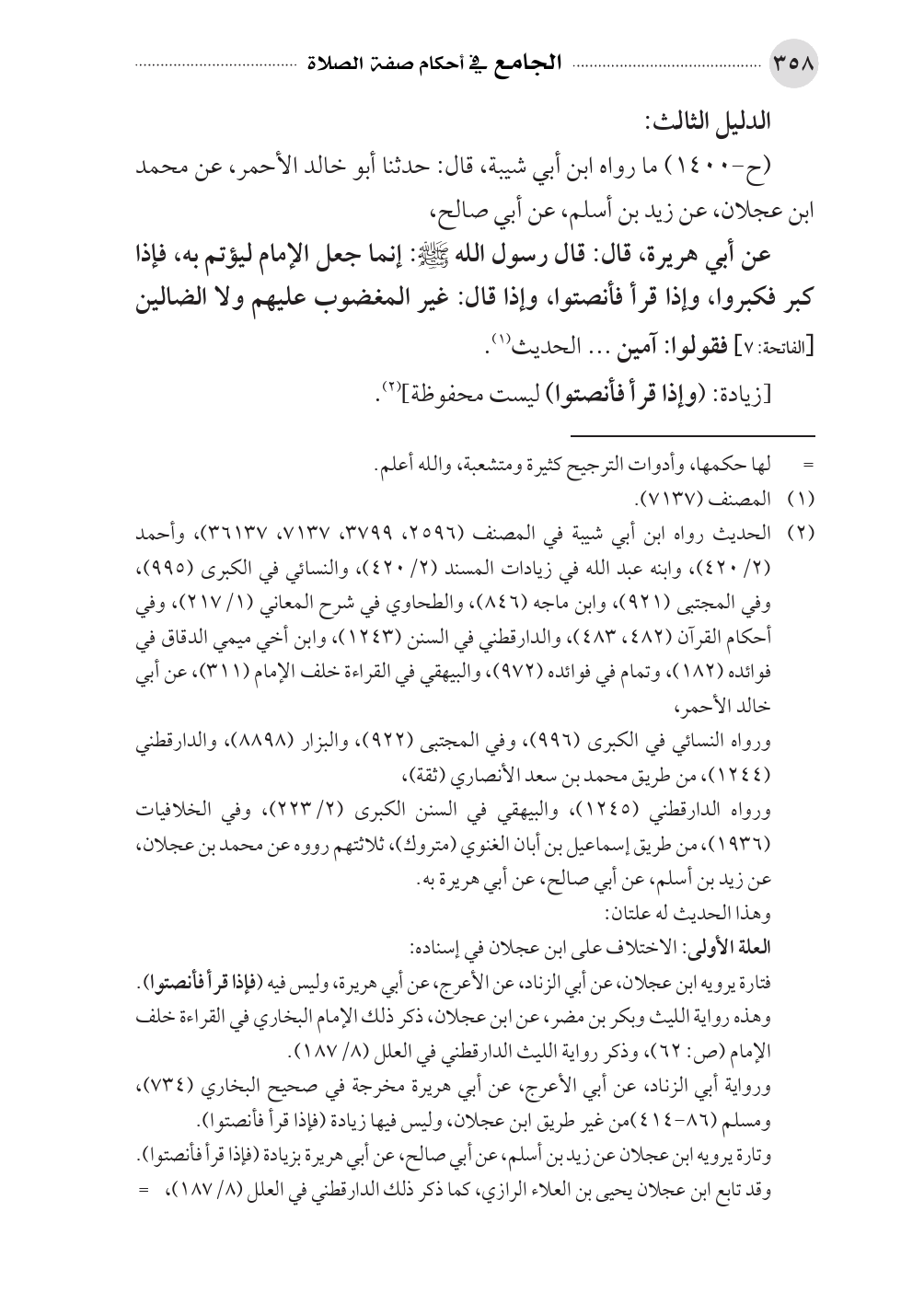 (¬٢). الحديث رواه ابن أبي شيبة في المصنف (٢٥٩٦، ٣٧٩٩، ٧١٣٧، ٣٦١٣٧)، وأحمد (٢/ ٤٢٠)، وابنه عبد الله في زيادات المسند (٢/ ٤٢٠)، والنسائي في الكبرى (٩٩٥)، وفي المجتبى (٩٢١)، وابن ماجه (٨٤٦)، والطحاوي في شرح المعاني (١/ ٢١٧)، وفي أحكام القرآن (٤٨٢، ٤٨٣)، والدارقطني في السنن (١٢٤٣)، وابن أخي ميمي الدقاق في فوائده (١٨٢)، وتمام في فوائده (٩٧٢)، والبيهقي في القراءة خلف الإمام (٣١١)، عن أبي خالد الأحمر،
