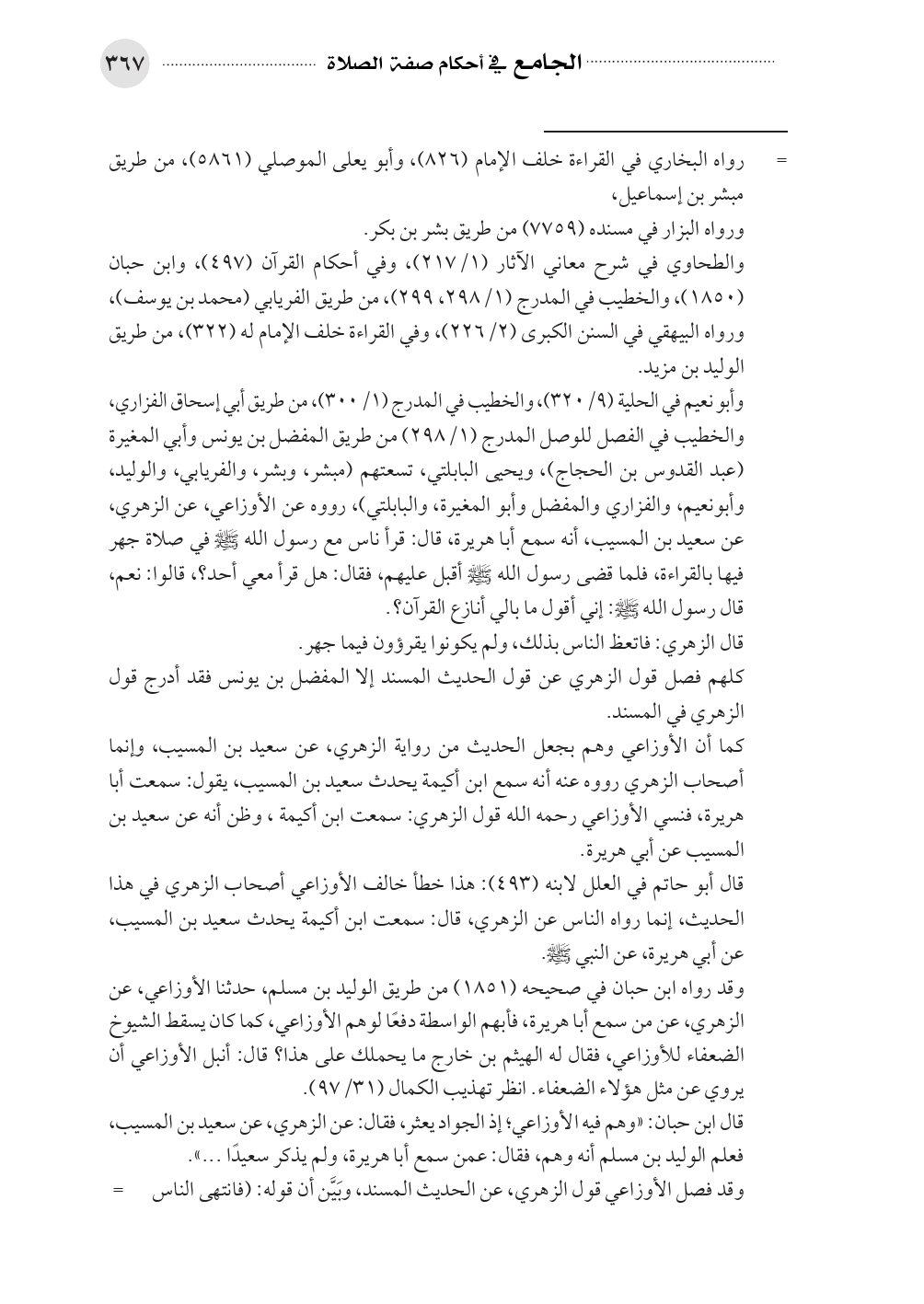 والخطيب في الفصل للوصل المدرج (١/ ٢٩٨) من طريق المفضل بن يونس وأبي المغيرة (عبد القدوس بن الحجاج)، ويحيى البابلتي، تسعتهم (مبشر، وبشر، والفريابي، والوليد، وأبونعيم، والفزاري والمفضل وأبو المغيرة، والبابلتي)، رووه عن الأوزاعي، عن الزهري، عن سعيد بن المسيب، أنه سمع أبا هريرة، قال: قرأ ناس مع رسول الله صلى الله عليه وسلم في صلاة جهر فيها بالقراءة، فلما قضى رسول الله صلى الله عليه وسلم أقبل عليهم، فقال: هل قرأ معي أحد؟، قالوا: نعم، قال رسول الله صلى الله عليه وسلم: إني أقول ما بالي أنازع القرآن؟.
