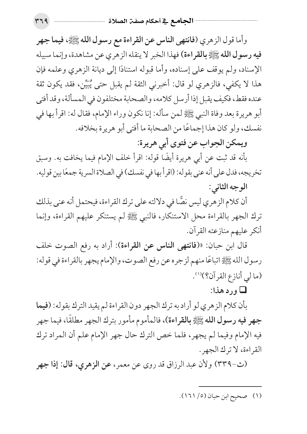 وأما قول الزهري (فانتهى الناس عن القراءة مع رسول الله صلى الله عليه وسلم، فيما جهر فيه رسول الله صلى الله عليه وسلم بالقراءة) فهذا الخبر لا ينقله الزهري عن مشاهدة، وإنما سبيله الإسناد، ولم يوقف على إسناده، وأما قبوله استنادًا إلى ديانة الزهري وعلمه فإن هذا لا يكفي، فالزهري لو قال: أخبرني الثقة لم يقبل حتى يُبَيِّن، فقد يكون ثقة عنده فقط، فكيف يقبل إذا أرسل كلامه، والصحابة مختلفون في المسألة، وقد أفتى أبو هريرة بعد وفاة النبي صلى الله عليه وسلم لمن سأله: إنا نكون وراء الإمام، فقال له: اقرأ بها في نفسك، ولو كان هذا إجماعًا من الصحابة ما أفتى أبو هريرة بخلافه.