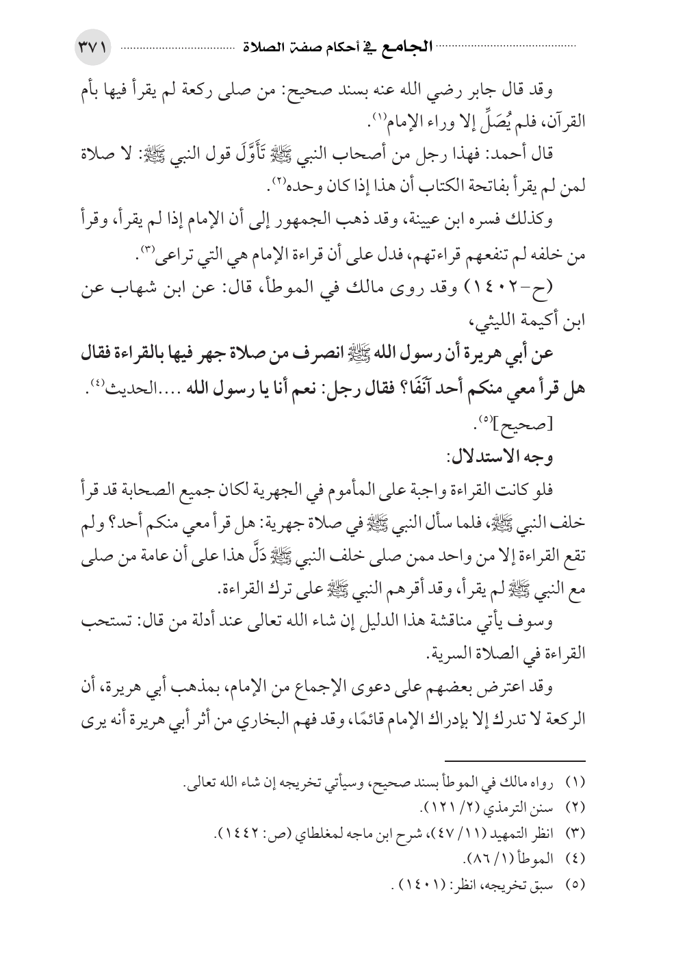 وقد قال جابر رضي الله عنه بسند صحيح: من صلى ركعة لم يقرأ فيها بأم القرآن، فلم يُصَلِّ إلا وراء الإمام (¬١).