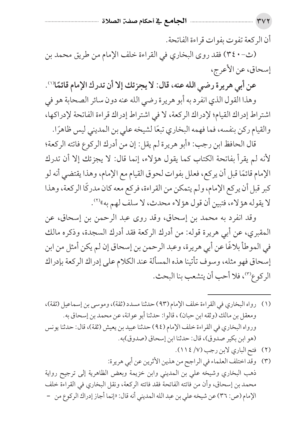 ذهب البخاري وشيخه علي بن المديني وابن خزيمة وبعض الظاهرية إلى ترجيح رواية محمد بن إسحاق، وأن من فاتته الفاتحة فقد فاتته الركعة، ونقل البخاري في القراءة خلف الإمام (ص: ٣٦) عن شيخه علي بن عبد الله المديني أنه قال: «إنما أجاز إدراك الركوع من =