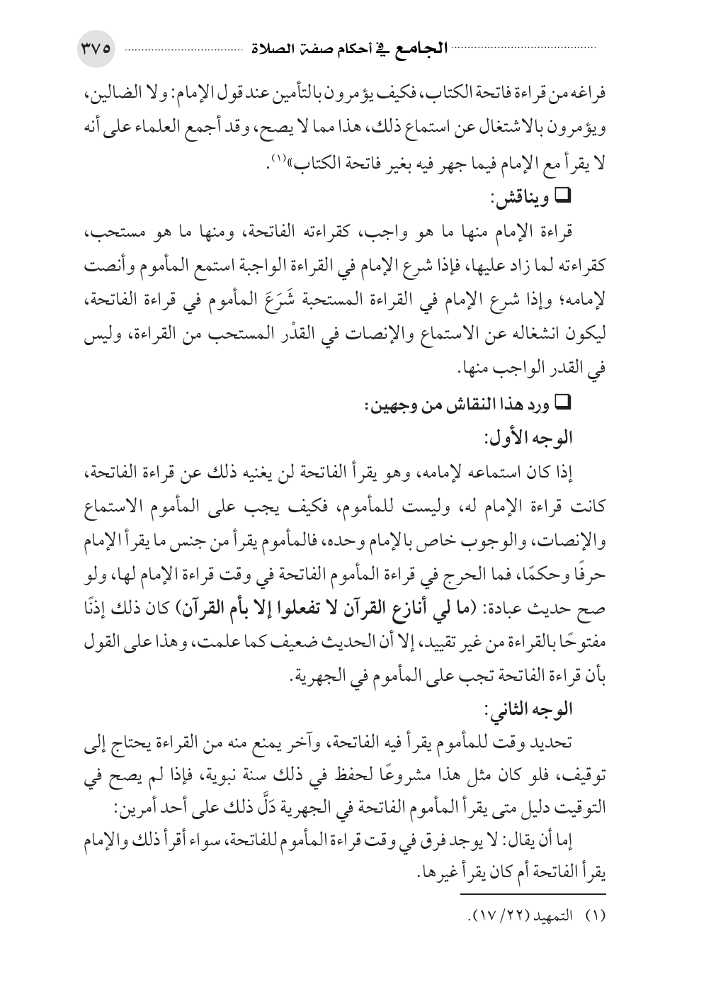 تحديد وقت للمأموم يقرأ فيه الفاتحة، وآخر يمنع منه من القراءة يحتاج إلى توقيف، فلو كان مثل هذا مشروعًا لحفظ في ذلك سنة نبوية، فإذا لم يصح في التوقيت دليل متى يقرأ المأموم الفاتحة في الجهرية دَلَّ ذلك على أحد أمرين: