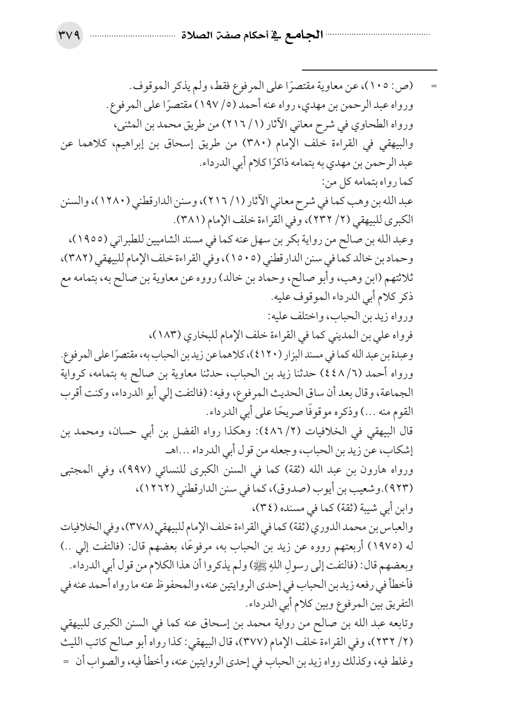 والعباس بن محمد الدوري (ثقة) كما في القراءة خلف الإمام للبيهقي (٣٧٨)، وفي الخلافيات له (١٩٧٥) أربعتهم رووه عن زيد بن الحباب به، مرفوعًا، بعضهم قال: (فالتفت إلي .. ) وبعضهم قال: (فالتفت إلى رسولِ اللهِ صلى الله عليه وسلم) ولم يذكروا أن هذا الكلام من قول أبي الدرداء.