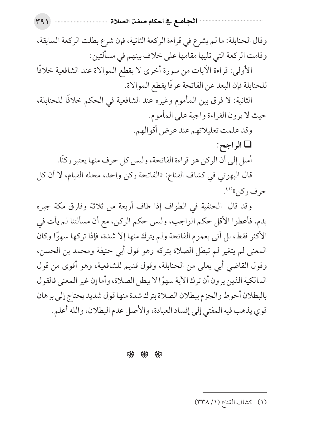 وقد قال الحنفية في الطواف إذا طاف أربعة من ثلاثة وفارق مكة جبره بدم، فأعطوا الأقل حكم الواجب، وليس حكم الركن، مع أن مسألتنا لم يأت في الأكثر فقط، بل أتى بعموم الفاتحة ولم يترك منها إلا شدة، فإذا تركها سهوًا وكان المعنى لم يتغير لم تبطل الصلاة بتركه وهو قول أبي حنيفة ومحمد بن الحسن، وقول القاضي أبي يعلى من الحنابلة، وقول قديم للشافعية، وهو أقوى من قول المالكية الذين يرون أن ترك الآية سهوًا لا يبطل الصلاة، وأما إن غير المعنى فالقول بالبطلان أحوط والجزم ببطلان الصلاة بترك شدة منها قول شديد يحتاج إلى برهان قوي يذهب فيه المفتي إلى إفساد العبادة، والأصل عدم البطلان، والله أعلم.