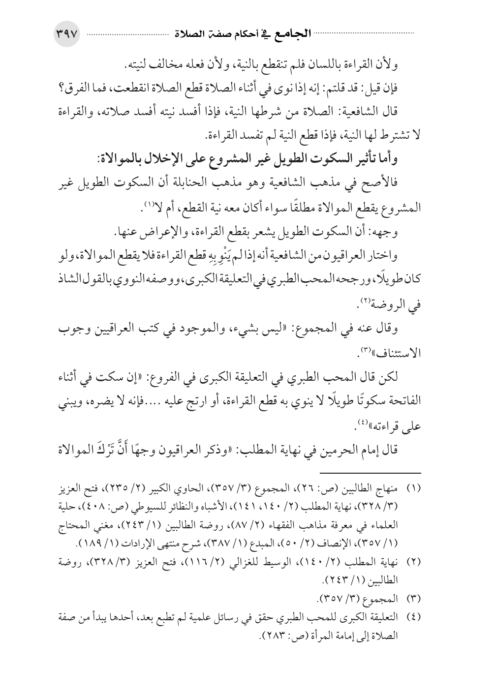 واختار العراقيون من الشافعية أنه إذا لم يَنْوِ بِهِ قطع القراءة فلا يقطع الموالاة، ولو كان طويلًا، ورجحه المحب الطبري في التعليقة الكبرى، ووصفه النووي بالقول الشاذ