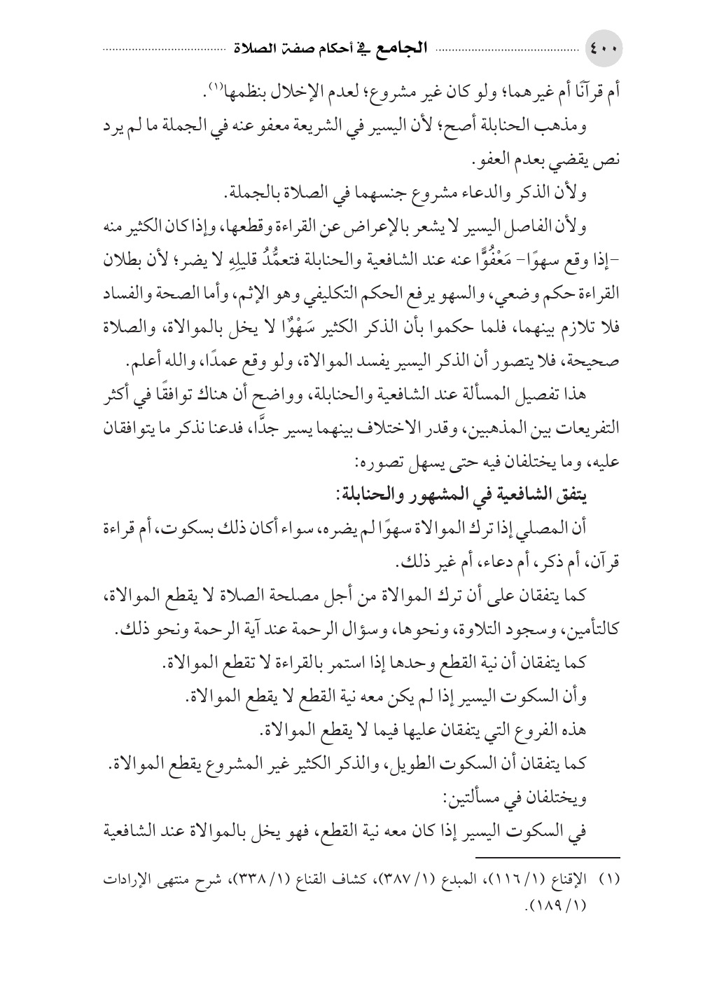 ولأن الفاصل اليسير لا يشعر بالإعراض عن القراءة وقطعها، وإذا كان الكثير منه -إذا وقع سهوًا- مَعْفُوًّا عنه عند الشافعية والحنابلة فتعمُّدُ قليلِهِ لا يضر؛ لأن بطلان القراءة حكم وضعي، والسهو يرفع الحكم التكليفي وهو الإثم، وأما الصحة والفساد فلا تلازم بينهما، فلما حكموا بأن الذكر الكثير سَهْوًا لا يخل بالموالاة، والصلاة صحيحة، فلا يتصور أن الذكر اليسير يفسد الموالاة، ولو وقع عمدًا، والله أعلم.