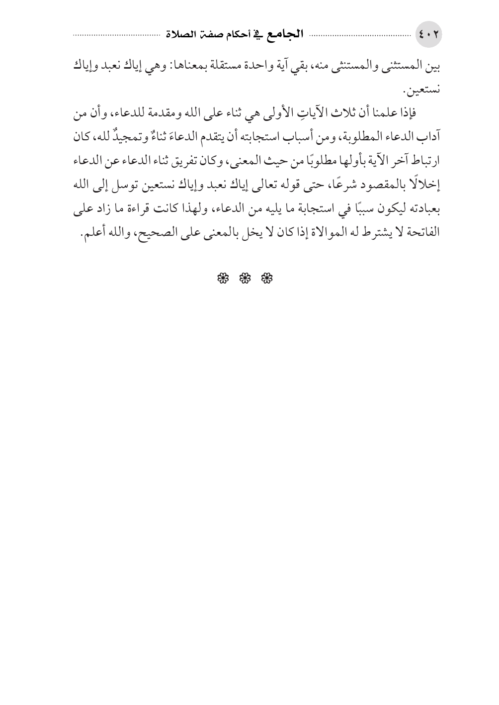 فإذا علمنا أن ثلاث الآياتِ الأولى هي ثناء على الله ومقدمة للدعاء، وأن من آداب الدعاء المطلوبة، ومن أسباب استجابته أن يتقدم الدعاءَ ثناءٌ وتمجيدٌ لله، كان ارتباط آخر الآية بأولها مطلوبًا من حيث المعنى، وكان تفريق ثناء الدعاء عن الدعاء إخلالًا بالمقصود شرعًا، حتى قوله تعالى إياك نعبد وإياك نستعين توسل إلى الله بعبادته ليكون سببًا في استجابة ما يليه من الدعاء، ولهذا كانت قراءة ما زاد على الفاتحة لا يشترط له الموالاة إذا كان لا يخل بالمعنى على الصحيح، والله أعلم.