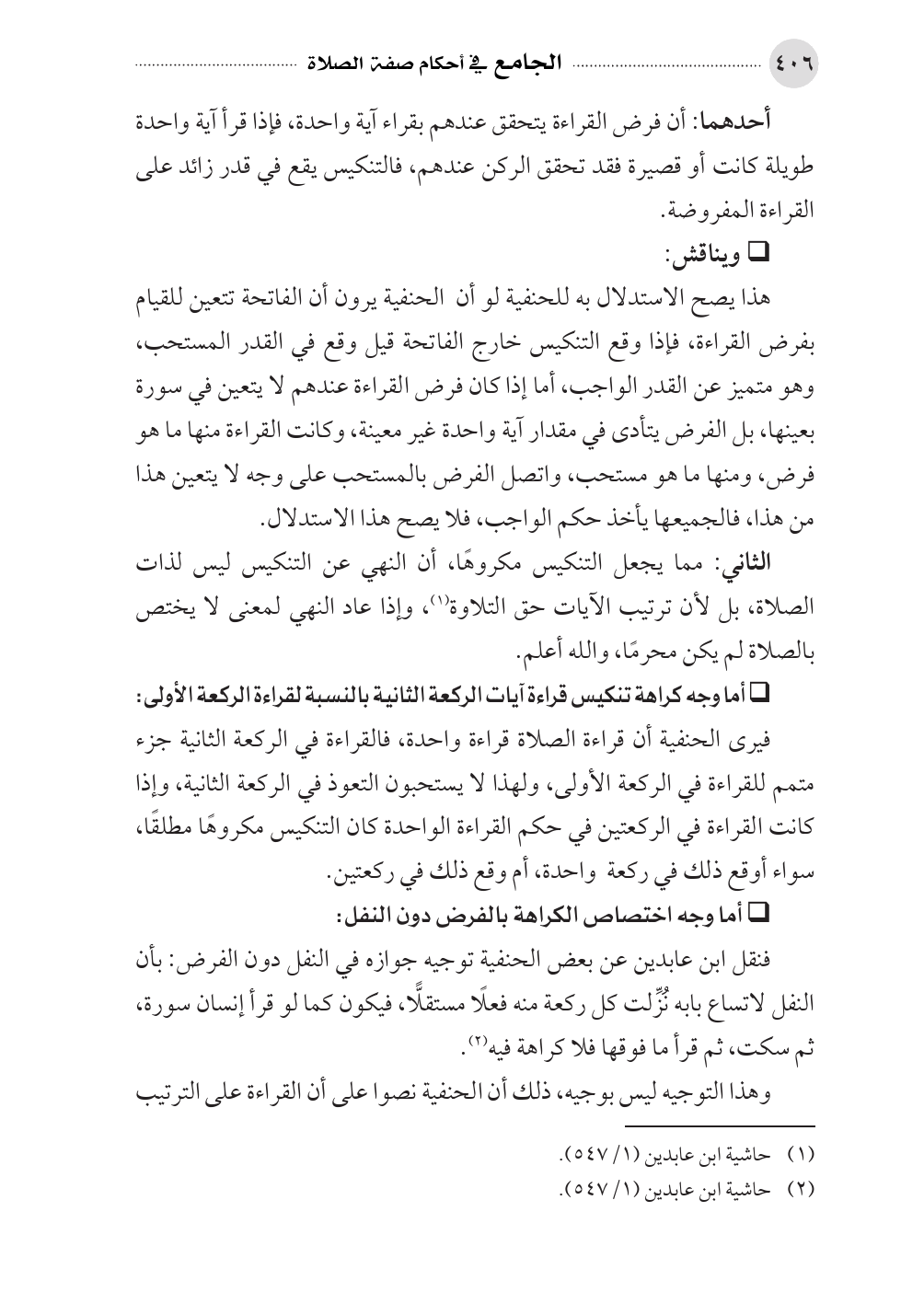 هذا يصح الاستدلال به للحنفية لو أن الحنفية يرون أن الفاتحة تتعين للقيام بفرض القراءة، فإذا وقع التنكيس خارج الفاتحة قيل وقع في القدر المستحب، وهو متميز عن القدر الواجب، أما إذا كان فرض القراءة عندهم لا يتعين في سورة بعينها، بل الفرض يتأدى في مقدار آية واحدة غير معينة، وكانت القراءة منها ما هو فرض، ومنها ما هو مستحب، واتصل الفرض بالمستحب على وجه لا يتعين هذا من هذا، فالجميعها يأخذ حكم الواجب، فلا يصح هذا الاستدلال.