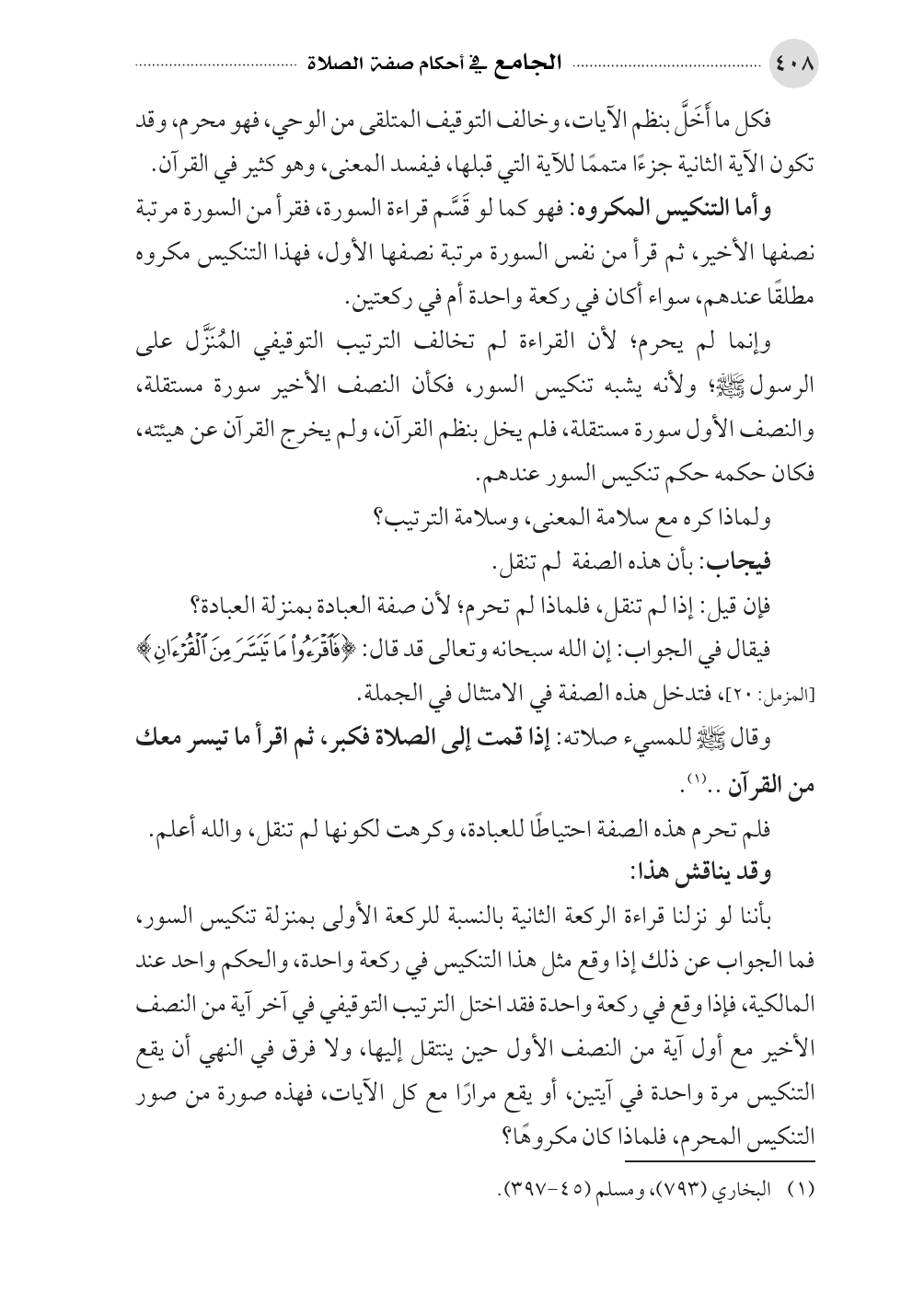بأننا لو نزلنا قراءة الركعة الثانية بالنسبة للركعة الأولى بمنزلة تنكيس السور، فما الجواب عن ذلك إذا وقع مثل هذا التنكيس في ركعة واحدة، والحكم واحد عند المالكية، فإذا وقع في ركعة واحدة فقد اختل الترتيب التوقيفي في آخر آية من النصف الأخير مع أول آية من النصف الأول حين ينتقل إليها، ولا فرق في النهي أن يقع التنكيس مرة واحدة في آيتين، أو يقع مرارًا مع كل الآيات، فهذه صورة من صور التنكيس المحرم، فلماذا كان مكروهًا؟