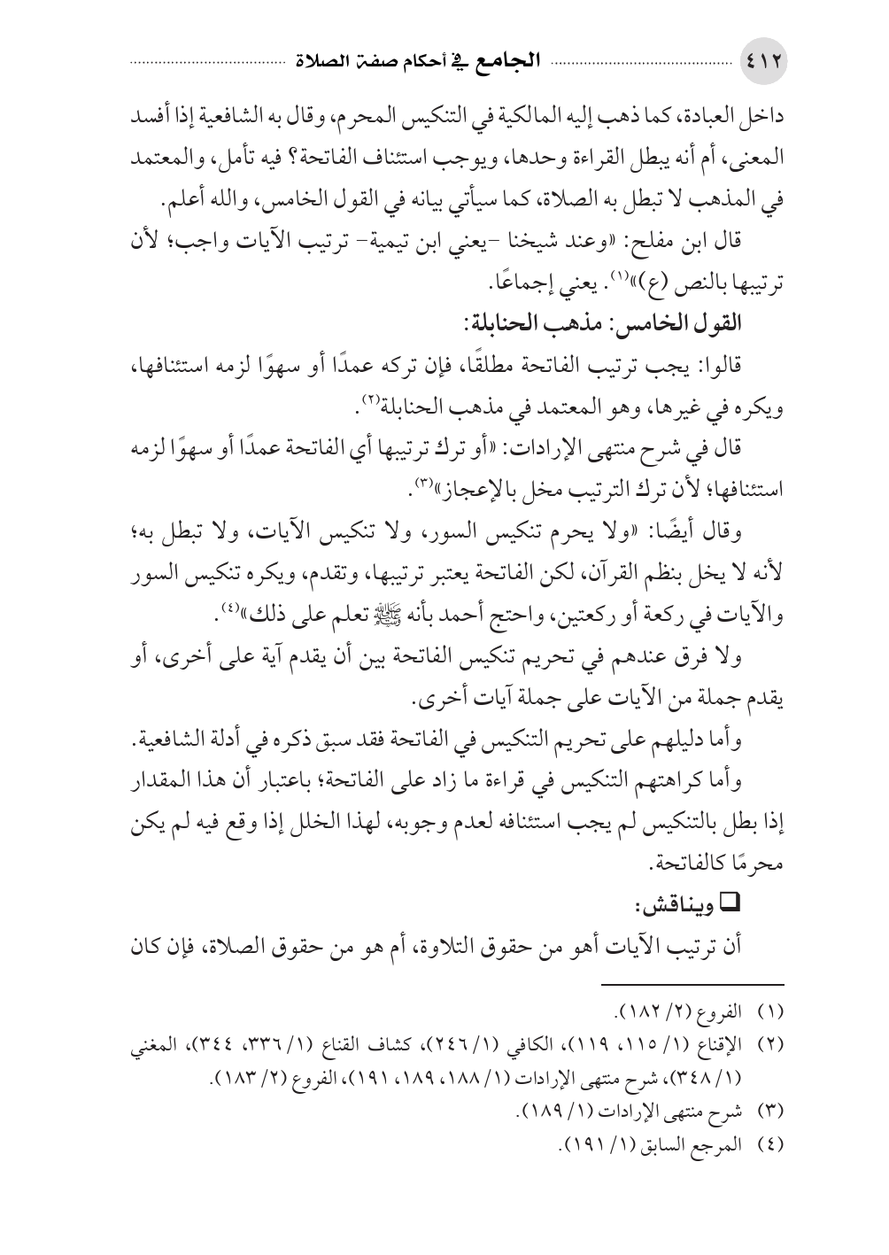 وقال أيضًا: «ولا يحرم تنكيس السور، ولا تنكيس الآيات، ولا تبطل به؛ لأنه لا يخل بنظم القرآن، لكن الفاتحة يعتبر ترتيبها، وتقدم، ويكره تنكيس السور والآيات في ركعة أو ركعتين، واحتج أحمد بأنه صلى الله عليه وسلم تعلم على ذلك» (¬٤).