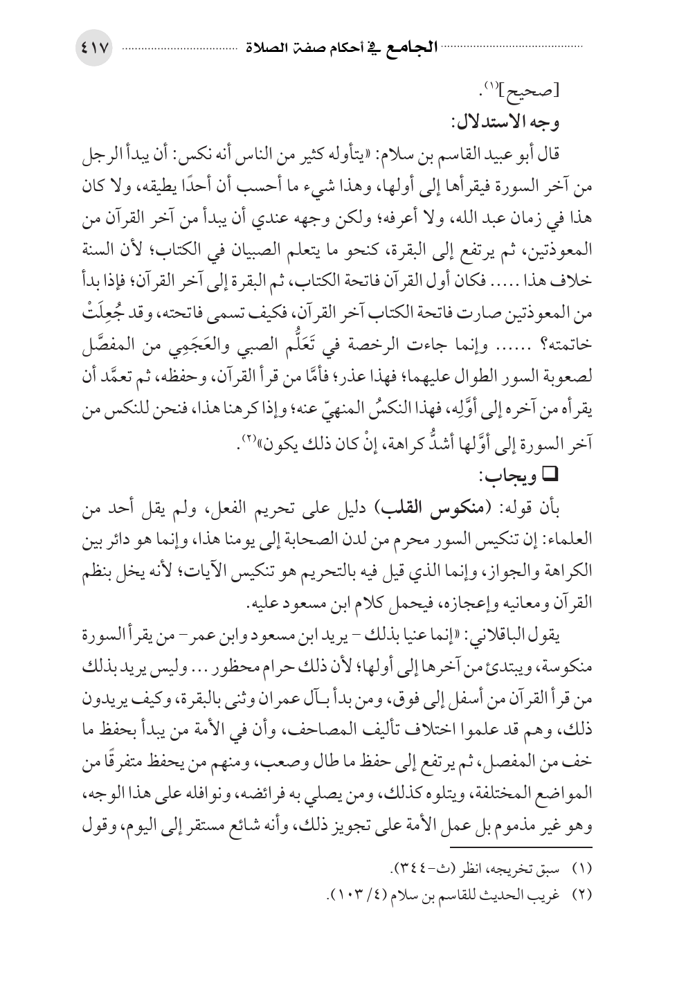 قال أبو عبيد القاسم بن سلام: «يتأوله كثير من الناس أنه نكس: أن يبدأ الرجل من آخر السورة فيقرأها إلى أولها، وهذا شيء ما أحسب أن أحدًا يطيقه، ولا كان هذا في زمان عبد الله، ولا أعرفه؛ ولكن وجهه عندي أن يبدأ من آخر القرآن من المعوذتين، ثم يرتفع إلى البقرة، كنحو ما يتعلم الصبيان في الكتاب؛ لأن السنة خلاف هذا ..... فكان أول القرآن فاتحة الكتاب، ثم البقرة إلى آخر القرآن؛ فإذا بدأ من المعوذتين صارت فاتحة الكتاب آخر القرآن، فكيف تسمى فاتحته، وقد جُعِلَتْ خاتمته؟ ...... وإنما جاءت الرخصة في تَعَلُّم الصبي والعَجَمِي من المفصَّل لصعوبة السور الطوال عليهما؛ فهذا عذر؛ فأمَّا من قرأ القرآن، وحفظه، ثم تعمَّد أن يقرأه من آخره إلى أوَّلِه، فهذا النكسُ المنهيّ عنه؛ وإذا كرهنا هذا، فنحن للنكس من آخر السورة إلى أوَّلها أشدُّ كراهة، إنْ كان ذلك يكون» (¬٢).