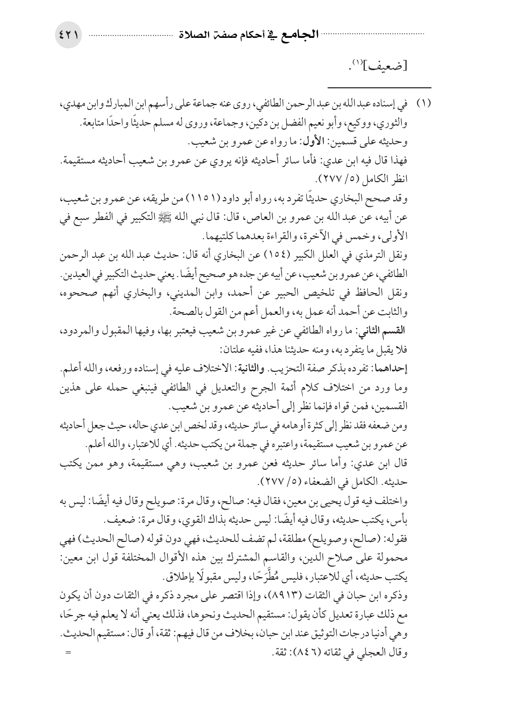 ونقل الترمذي في العلل الكبير (١٥٤) عن البخاري أنه قال: حديث عبد الله بن عبد الرحمن الطائفي، عن عمرو بن شعيب، عن أبيه عن جده هو صحيح أيضًا. يعني حديث التكبير في العيدين.