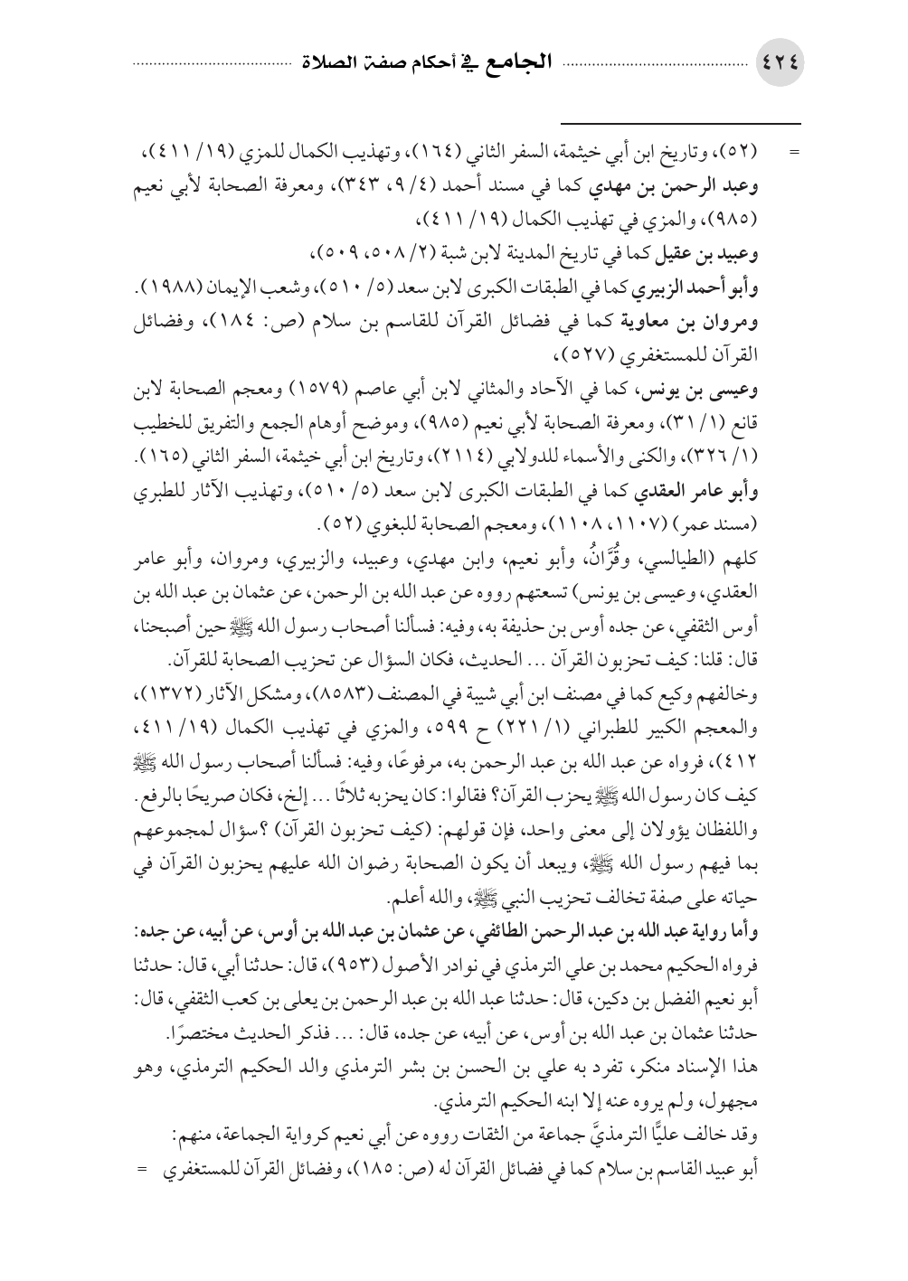 كلهم (الطيالسي، وقُرَّانُ، وأبو نعيم، وابن مهدي، وعبيد، والزبيري، ومروان، وأبو عامر العقدي، وعيسى بن يونس) تسعتهم رووه عن عبد الله بن الرحمن، عن عثمان بن عبد الله بن أوس الثقفي، عن جده أوس بن حذيفة به، وفيه: فسألنا أصحاب رسول الله صلى الله عليه وسلم حين أصبحنا، قال: قلنا: كيف تحزبون القرآن ... الحديث، فكان السؤال عن تحزيب الصحابة للقرآن.