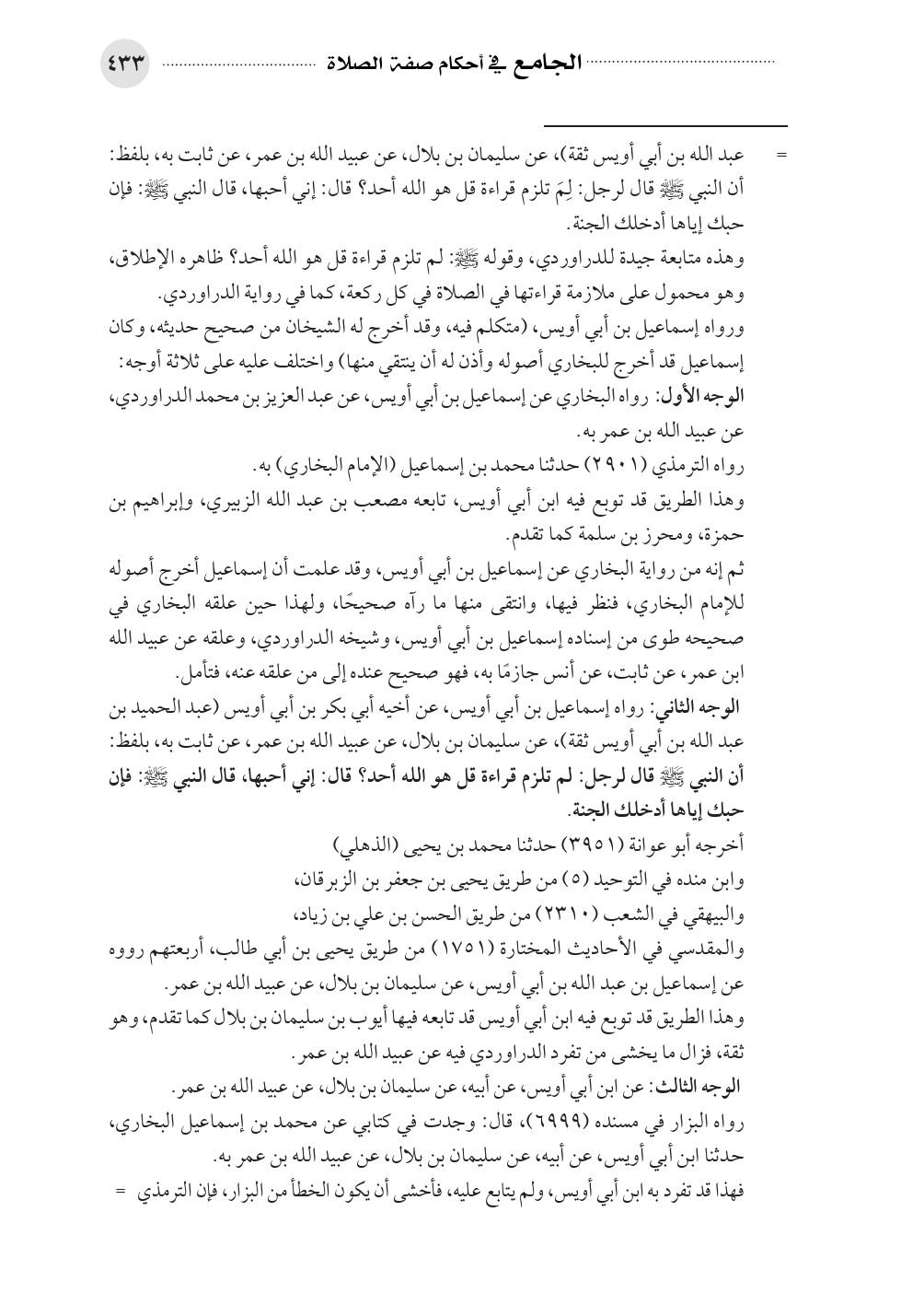 = عبد الله بن أبي أويس ثقة)، عن سليمان بن بلال، عن عبيد الله بن عمر، عن ثابت به، بلفظ: أن النبي صلى الله عليه وسلم قال لرجل: لِمَ تلزم قراءة قل هو الله أحد؟ قال: إني أحبها، قال النبي صلى الله عليه وسلم: فإن حبك إياها أدخلك الجنة.