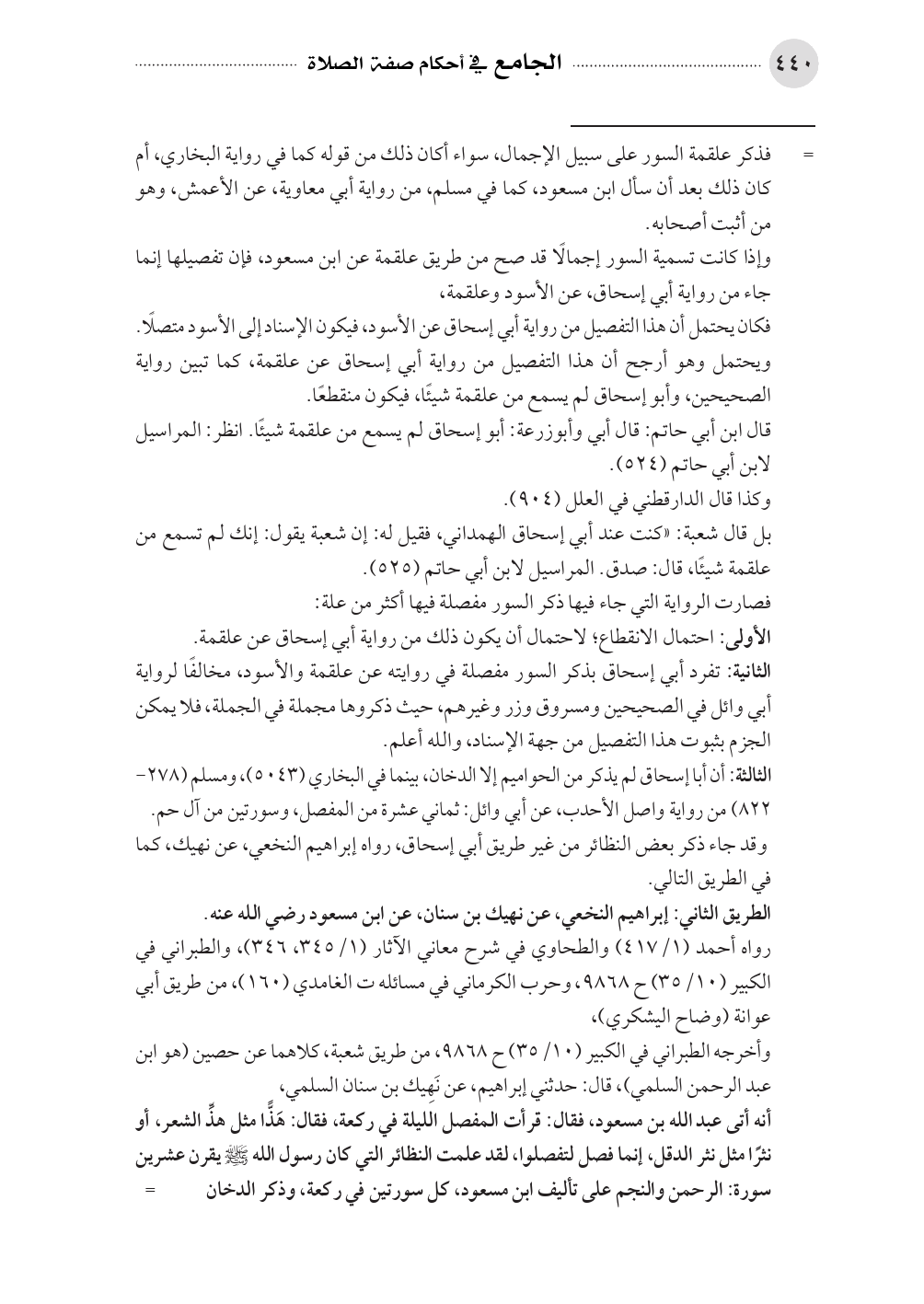 الثانية: تفرد أبي إسحاق بذكر السور مفصلة في روايته عن علقمة والأسود، مخالفًا لرواية أبي وائل في الصحيحين ومسروق وزر وغيرهم، حيث ذكروها مجملة في الجملة، فلا يمكن الجزم بثبوت هذا التفصيل من جهة الإسناد، والله أعلم.