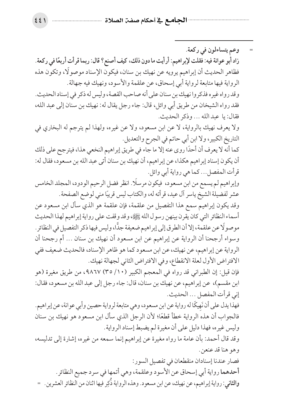 وقد يكون إبراهيم سمع هذا التفصيل من علقمة، فإن علقمة هو الذي سأل ابن مسعود عن أسماء النظائر التي كان يقرن بينهن رسول الله صلى الله عليه وسلم، وقد وقفت على رواية إبراهيم لهذا الحديث موصولًا عن علقمة، إلا أن الطرق إلى إبراهيم ضعيفة جدًّا، وليس فيها ذكر التفصيل في النظائر.
