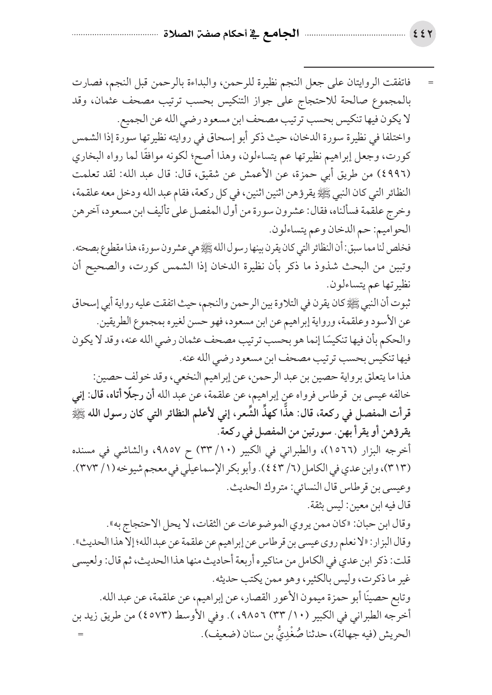 ثبوت أن النبي صلى الله عليه وسلم كان يقرن في التلاوة بين الرحمن والنجم، حيث اتفقت عليه رواية أبي إسحاق عن الأسود وعلقمة، ورواية إبراهيم عن ابن مسعود، فهو حسن لغيره بمجموع الطريقين.