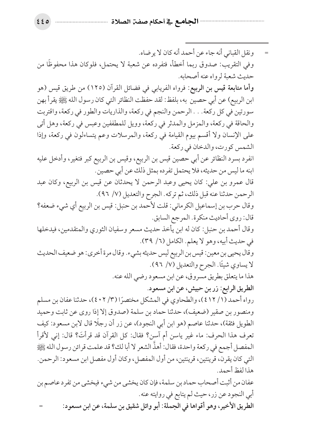 وأما متابعة قيس بن الربيع: فرواه الفريابي في فضائل القرآن (١٢٥) من طريق قيس (هو ابن الربيع) عن أبي حصين به، بلفظ: لقد حفظت النظائر التي كان رسول الله صلى الله عليه وسلم يقرأ بهن سورتين في كل ركعة. . . الرحمن والنجم في ركعة، والذاريات والطور في ركعة، واقتربت والحاقة في ركعة، والمزمل والمدثر في ركعة، وويل للمطففين وعبس في ركعة، وهل أتى على الإنسان ولا أقسم بيوم القيامة في ركعة، والمرسلات وعم يتساءلون في ركعة، وإذا الشمس كورت، والدخان في ركعة.