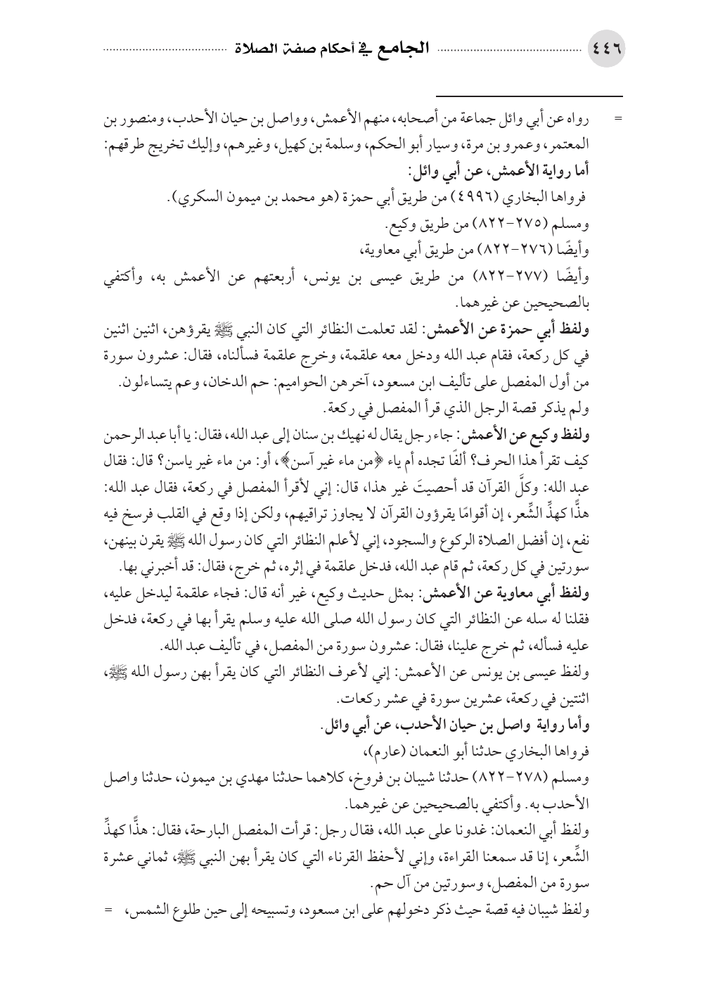 ولفظ أبي معاوية عن الأعمش: بمثل حديث وكيع، غير أنه قال: فجاء علقمة ليدخل عليه، فقلنا له سله عن النظائر التي كان رسول الله صلى الله عليه وسلم يقرأ بها في ركعة، فدخل عليه فسأله، ثم خرج علينا، فقال: عشرون سورة من المفصل، في تأليف عبد الله.