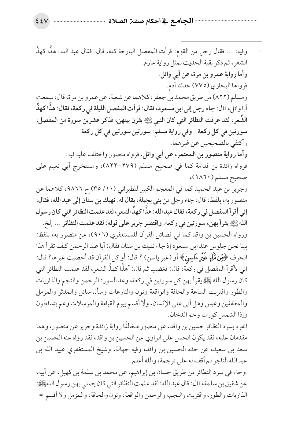 ومسلم (٨٢٢) من طريق محمد بن جعفر، كلاهما عن شعبة، عن عمرو بن مرة، قال: سمعت أبا وائل، قال: جاء رجل إلى ابن مسعود، فقال: قرأت المفصل الليلة في ركعة، فقال: هذًّا كهذِّ الشِّعر، لقد عرفت النظائر التي كان النبي صلى الله عليه وسلم يقرن بينهن، فذكر عشرين سورة من المفصل، سورتين في كل ركعة .. وفي رواية مسلم: سورتين سورتين في كل ركعة.