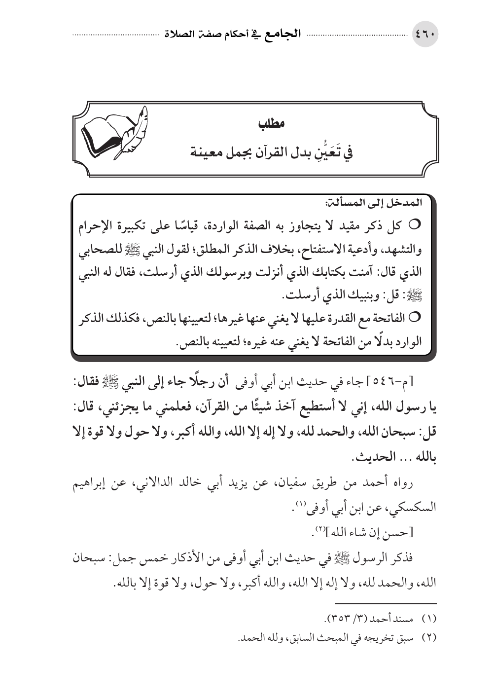 [م-٥٤٦] جاء في حديث ابن أبي أوفى أن رجلًا جاء إلى النبي صلى الله عليه وسلم فقال: يا رسول الله، إني لا أستطيع آخذ شيئًا من القرآن، فعلمني ما يجزئني، قال: قل: سبحان الله، والحمد لله، ولا إله إلا الله، والله أكبر، ولا حول ولا قوة إلا بالله ... الحديث.