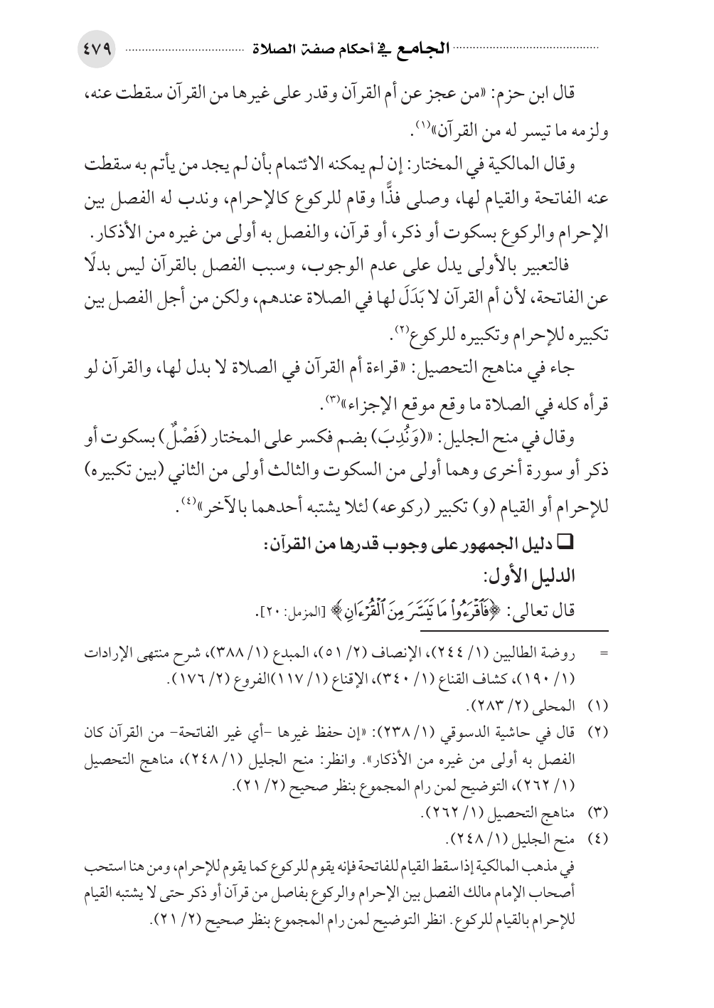 (¬٢). قال في حاشية الدسوقي (١/ ٢٣٨): «إن حفظ غيرها -أي غير الفاتحة- من القرآن كان الفصل به أولى من غيره من الأذكار». وانظر: منح الجليل (١/ ٢٤٨)، مناهج التحصيل (١/ ٢٦٢)، التوضيح لمن رام المجموع بنظر صحيح (٢/ ٢١).
