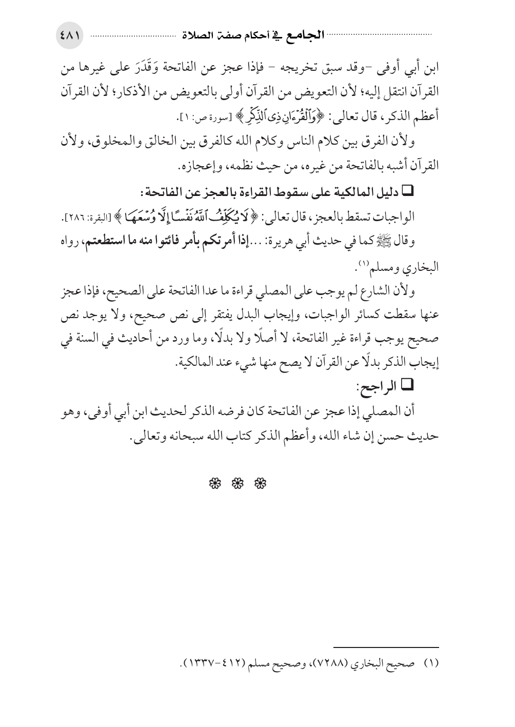 ولأن الشارع لم يوجب على المصلي قراءة ما عدا الفاتحة على الصحيح، فإذا عجز عنها سقطت كسائر الواجبات، وإيجاب البدل يفتقر إلى نص صحيح، ولا يوجد نص صحيح يوجب قراءة غير الفاتحة، لا أصلًا ولا بدلًا، وما ورد من أحاديث في السنة في إيجاب الذكر بدلًا عن القرآن لا يصح منها شيء عند المالكية.