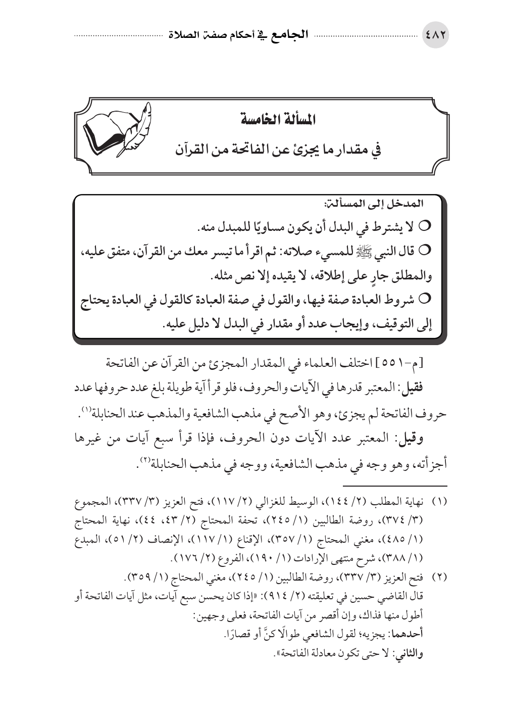 (¬١). نهاية المطلب (٢/ ١٤٤)، الوسيط للغزالي (٢/ ١١٧)، فتح العزيز (٣/ ٣٣٧)، المجموع (٣/ ٣٧٤)، روضة الطالبين (١/ ٢٤٥)، تحفة المحتاج (٢/ ٤٣، ٤٤)، نهاية المحتاج (١/ ٤٨٥)، مغني المحتاج (١/ ٣٥٧)، الإقناع (١/ ١١٧)، الإنصاف (٢/ ٥١)، المبدع (١/ ٣٨٨)، شرح منتهى الإرادات (١/ ١٩٠)، الفروع (٢/ ١٧٦).